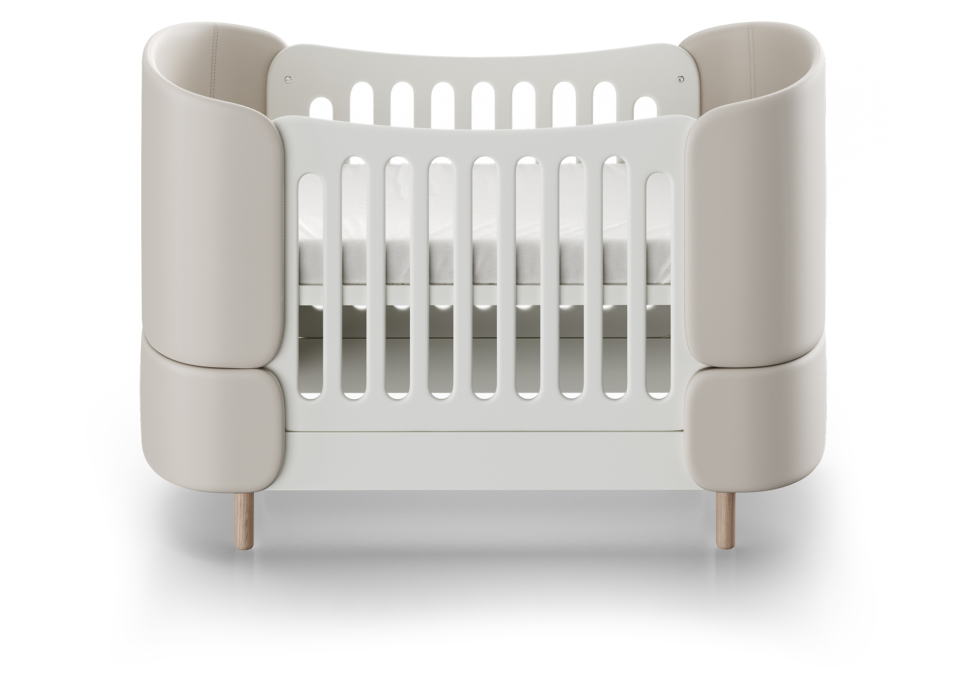 Кроватка-трансформер KIDI Soft с мягкими спинками из экокожи имеет увеличенный размер спального места, что позволяет использовать кроватку даже в базовой комплектации до 4 лет