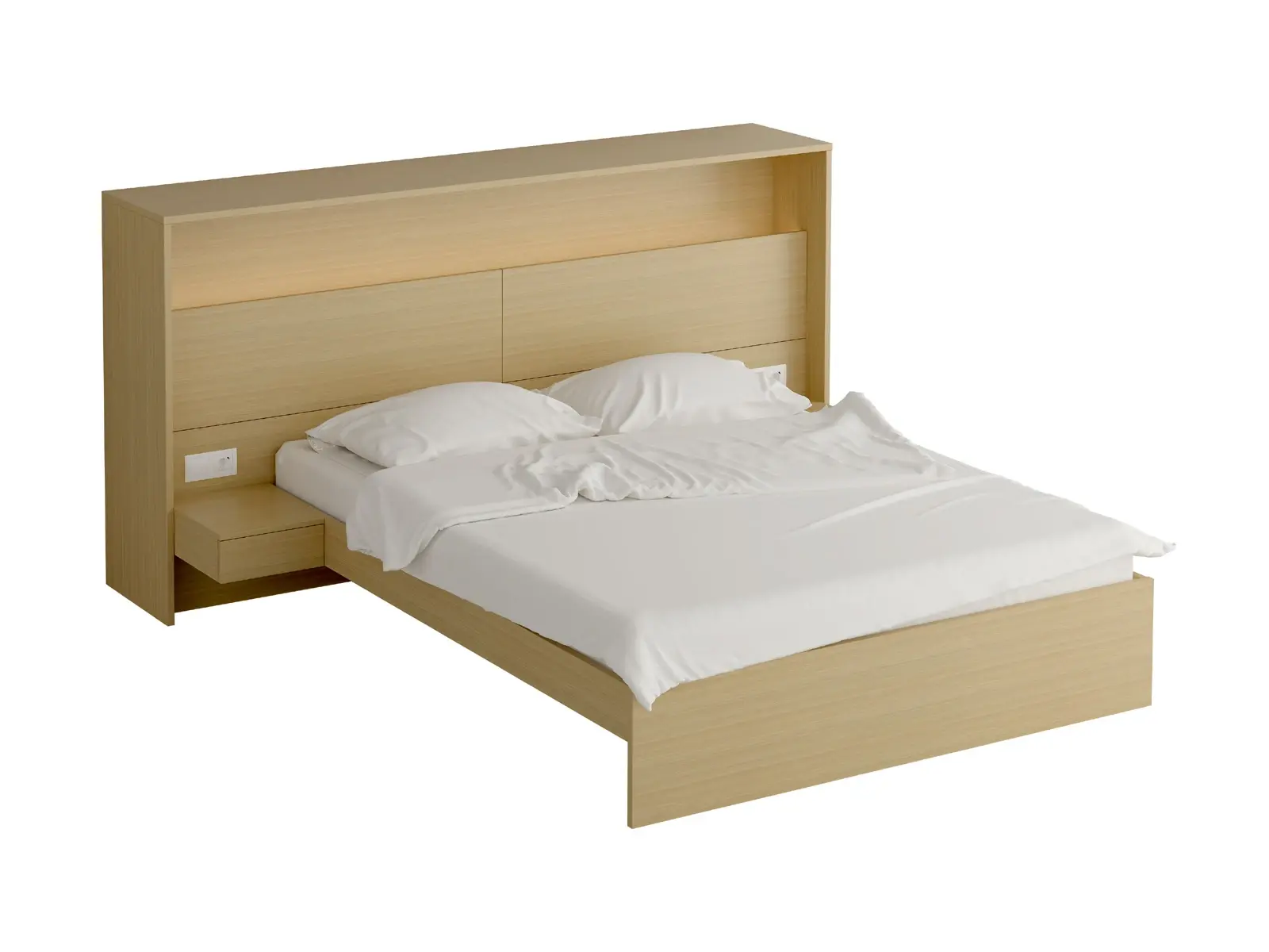 Кроватный блок представляет собой единую композицию из кровати, прикроватного шкафа и двух тумб. Спальное место 1600х2000 мм. Прикроватный шкаф присоединен к кровати и выполняет функцию головной спинки. Шкаф имеет два отделения за откидными дверями и открытую полку над ними. Двери открываются за кромку, оснащены газовыми кронштейнами. Справа и слева от кровати расположены тумбы с ящиками. Кроватный блок оснащен светодиодным светильником, расположенным в открытой полке прикроватного шкафа. Над каждой тумбой установлен выключатель и электрическая розетка с разъемом USB.