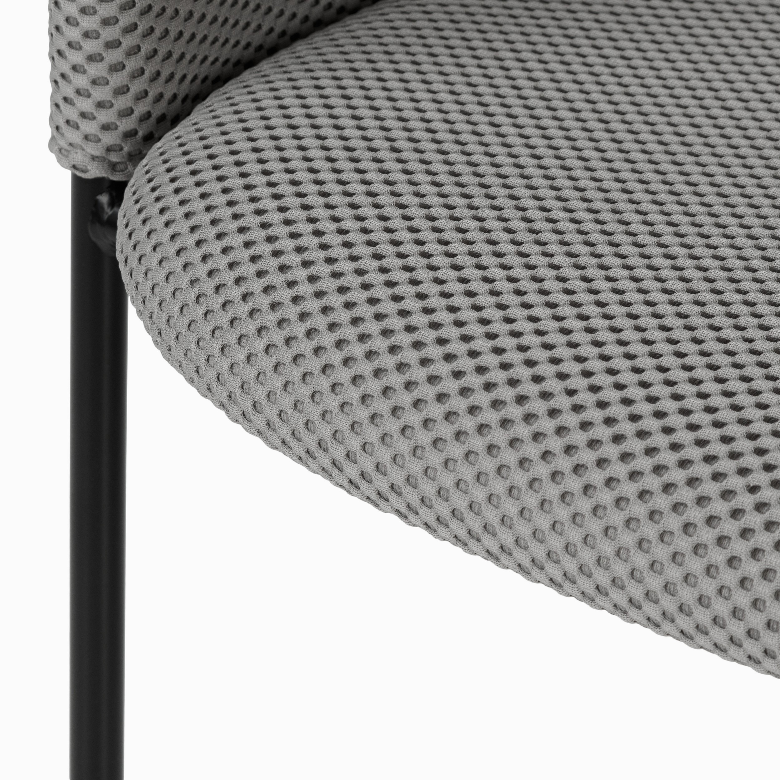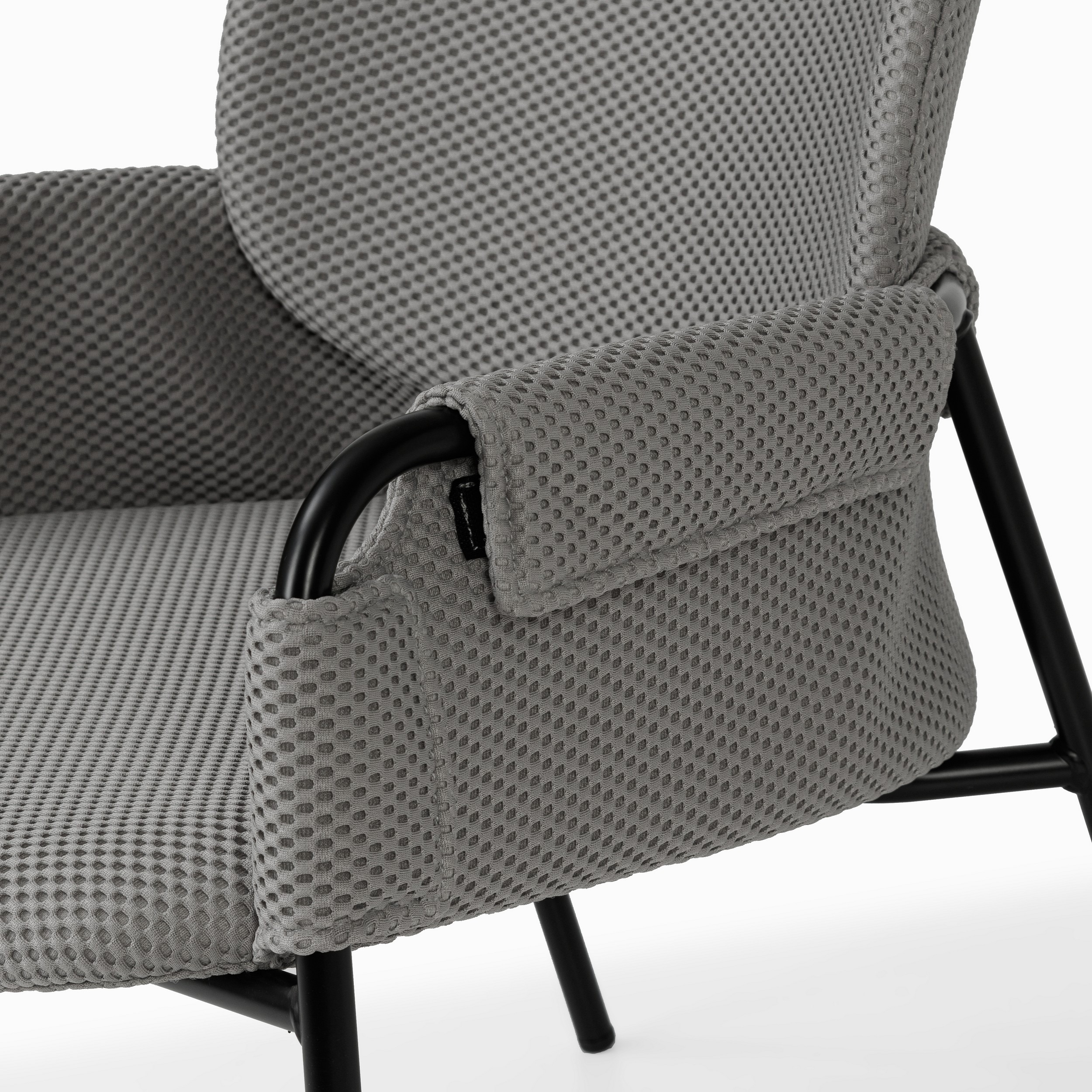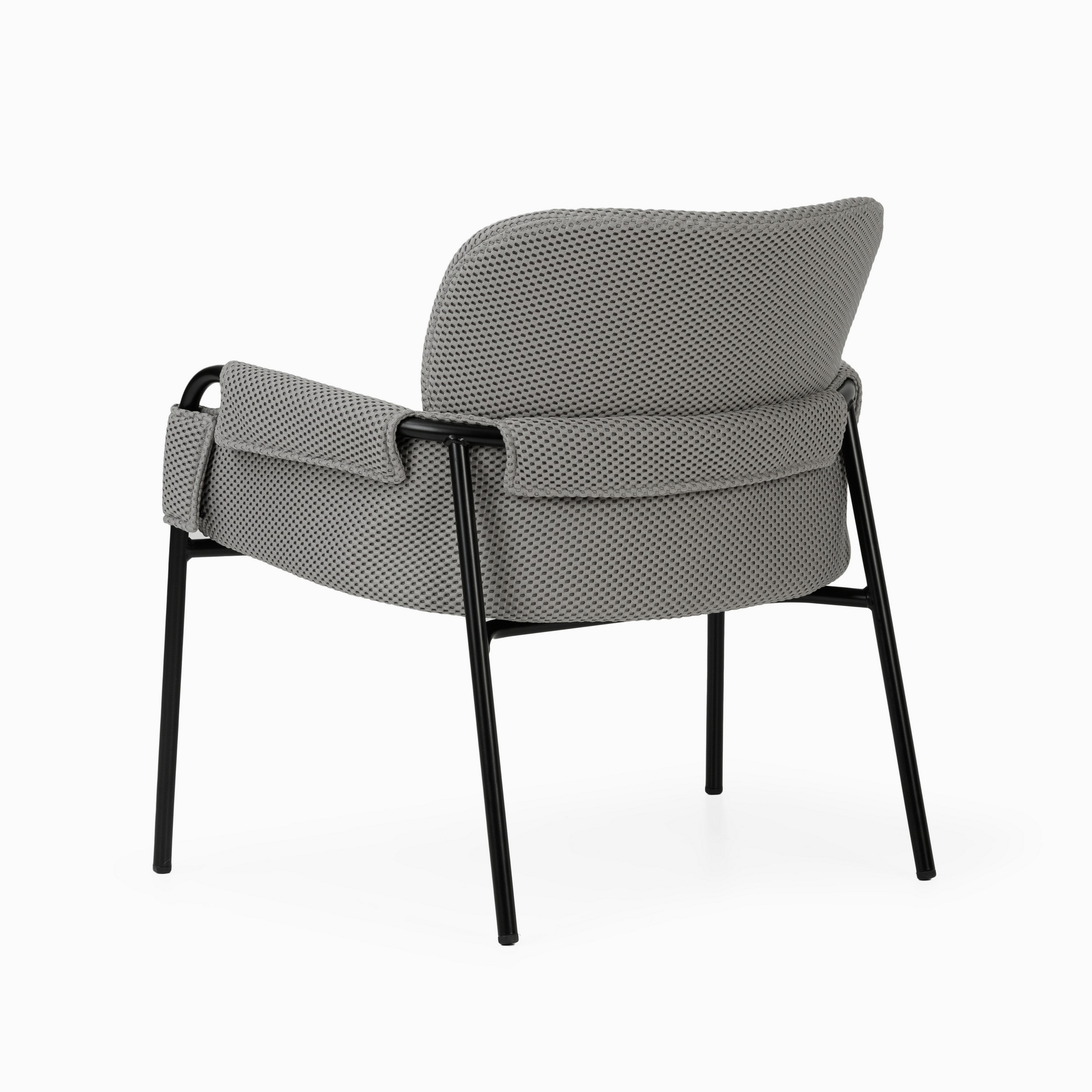 Его особенностью является оригинальный металлический каркас чёрного цвета, образующий основу сиденья и подлокотников, создавая лёгкий и воздушный силуэт. Мягкие элементы кресла — сиденье, спинка и подлокотники — обтянуты фактурной тканью в нейтральных оттенках.