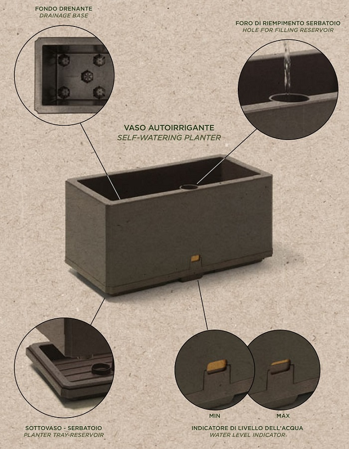 Sipario Vaso - это самополивающийся модуль-кашпо для отдельно стоящего модульного кашпо Sipario.