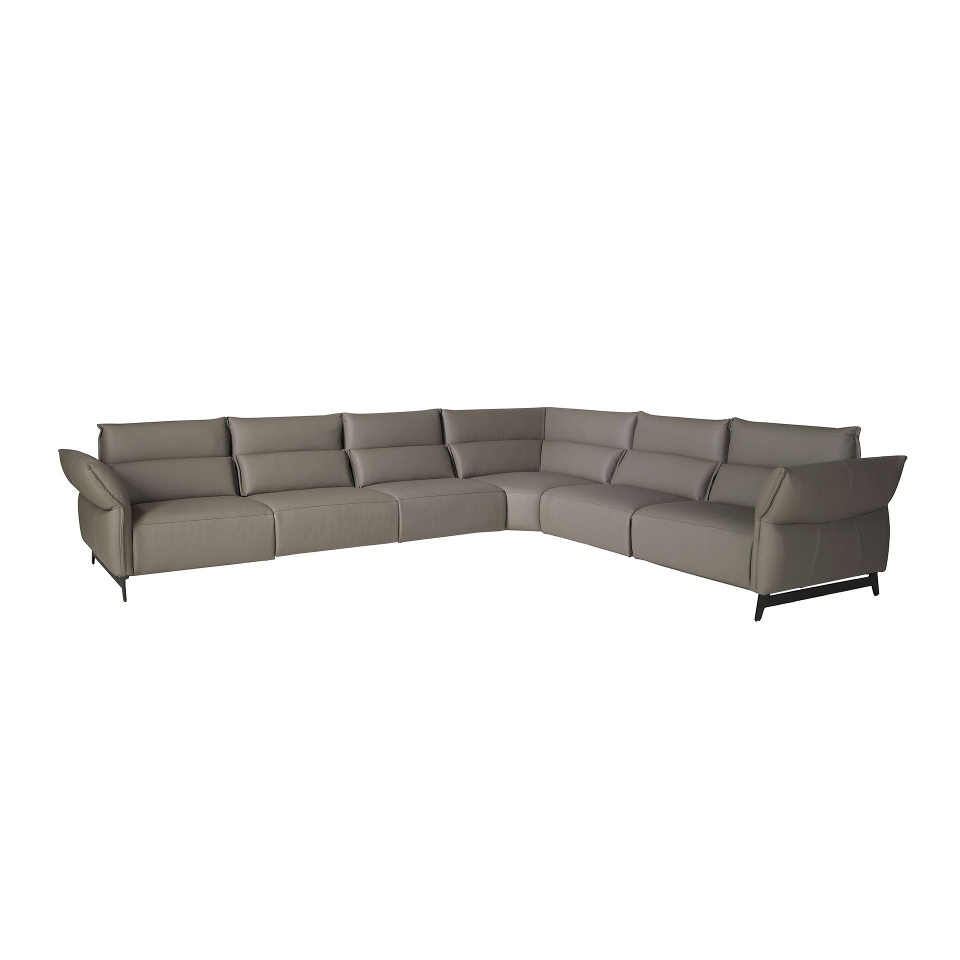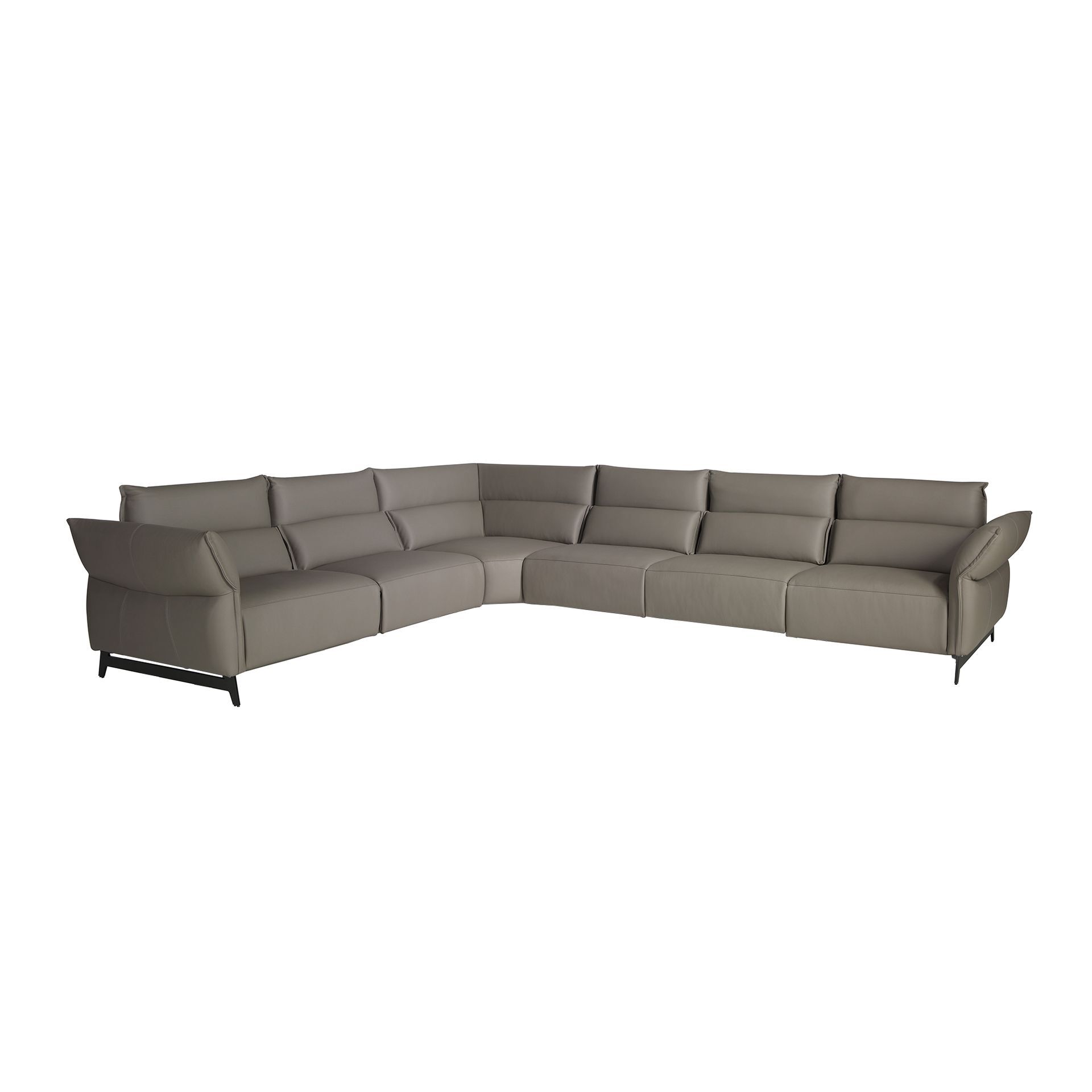Модульный угловой диван для отдыха на 5 мест с современным дизайном, обитый темно-серой воловьей кожей, с подголовником для большего комфорта. Благодаря своему стилю и черным ножкам из нержавеющей стали этот диван привнесет в ваш дом нотку авангарда и элегантности, которую вы ищете. Две электрические системы релаксации обеспечат вам дополнительный комфорт и расслабление.