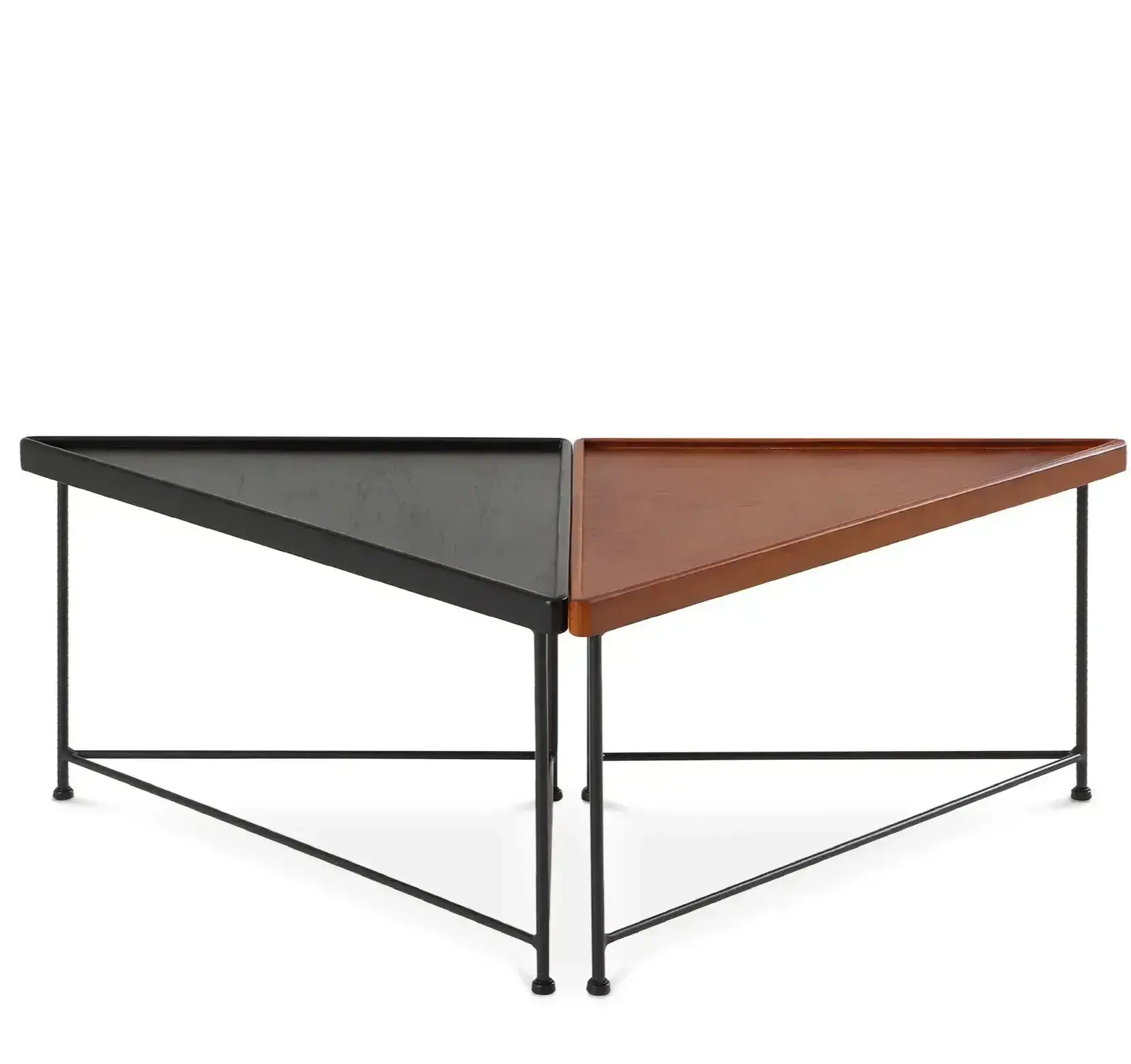 Журнальный столик в минималистичном стиле станет финальным штрихом в любом пространстве. В его дизайне элегантность смело сочетается с ритмичностью формы. Треугольную столешницу из массива дерева поддерживают грациозные ножки из металла, которые дополнительно укреплены перекладинами.