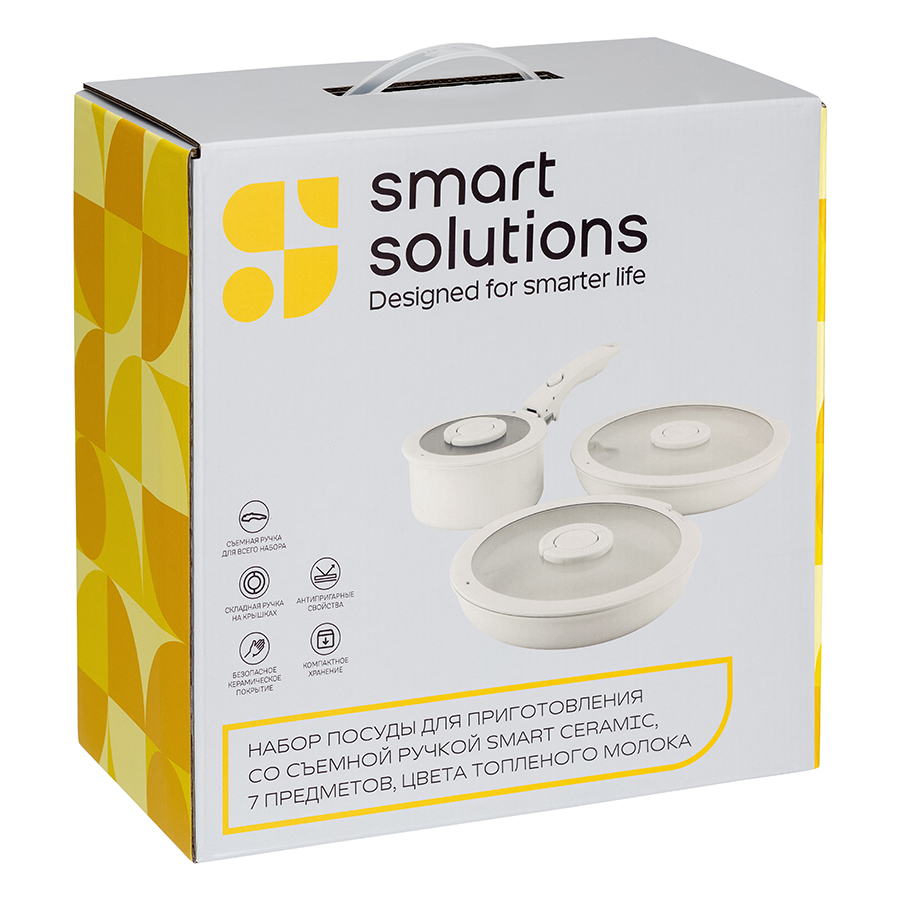 Набор Smart Ceramic – уникальное сочетание традиций и инноваций для тех, кто ценит качество и удобство на кухне. Посуда с керамическим покрытием позволяет приготовить вкусные и сочные блюда практически без добавления масла. Оригинальная округлая форма и съемная ручка делают использование и хранение максимально удобным – сковороды и ковш легко помещаются в холодильнике или на полке шкафа, экономя пространство, а их гладкая поверхность быстро очищается от любых загрязнений.