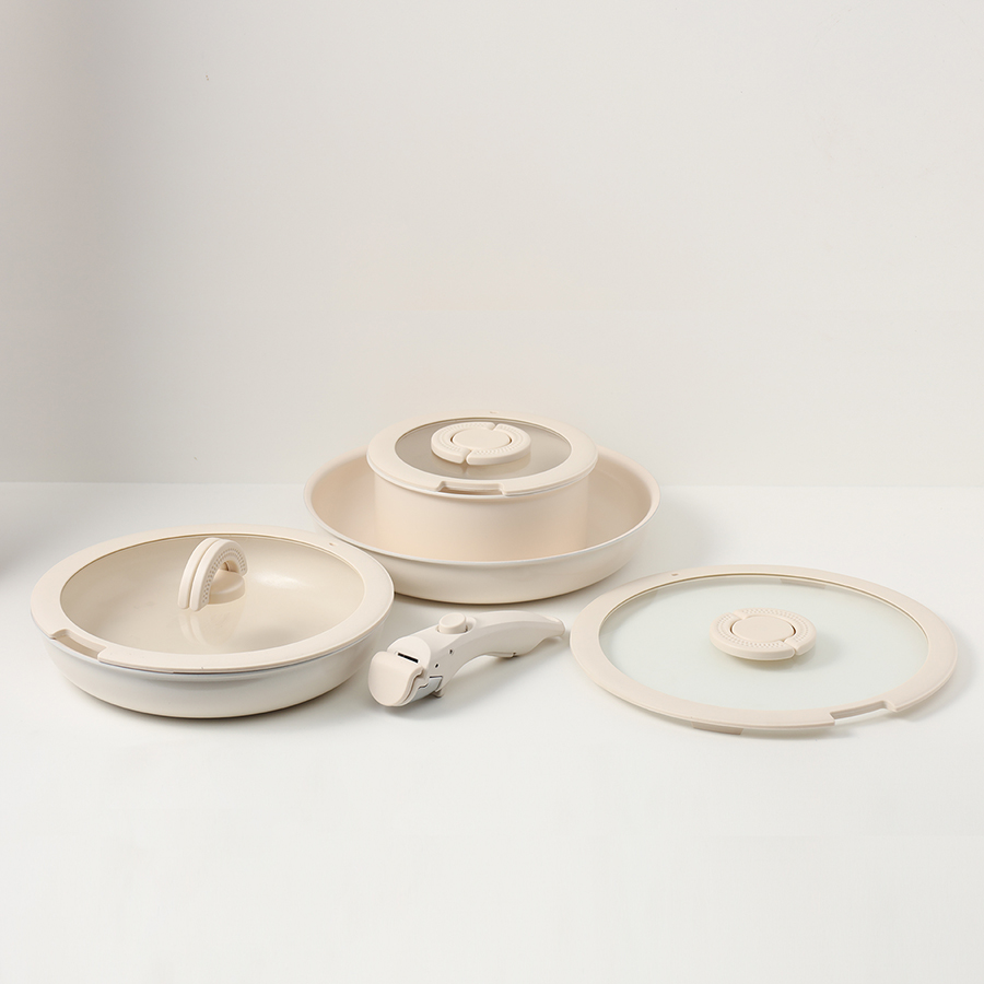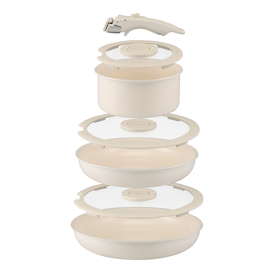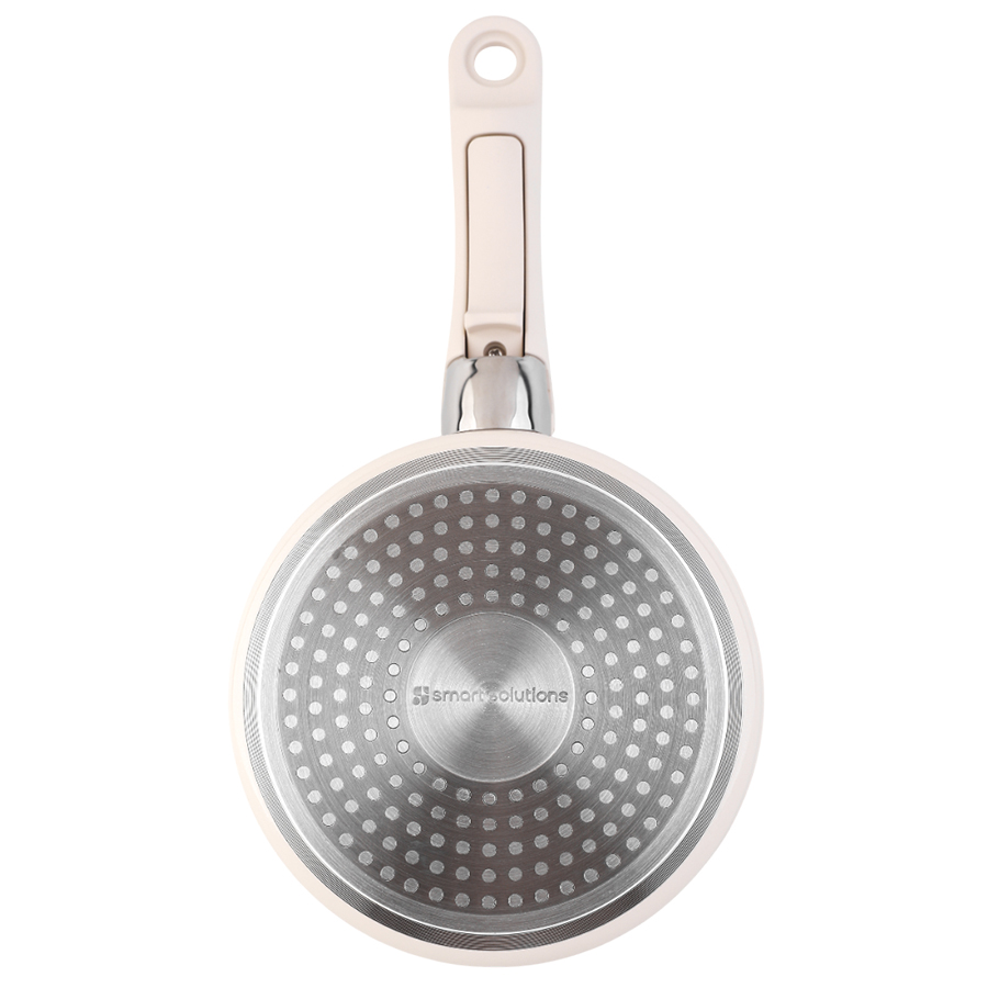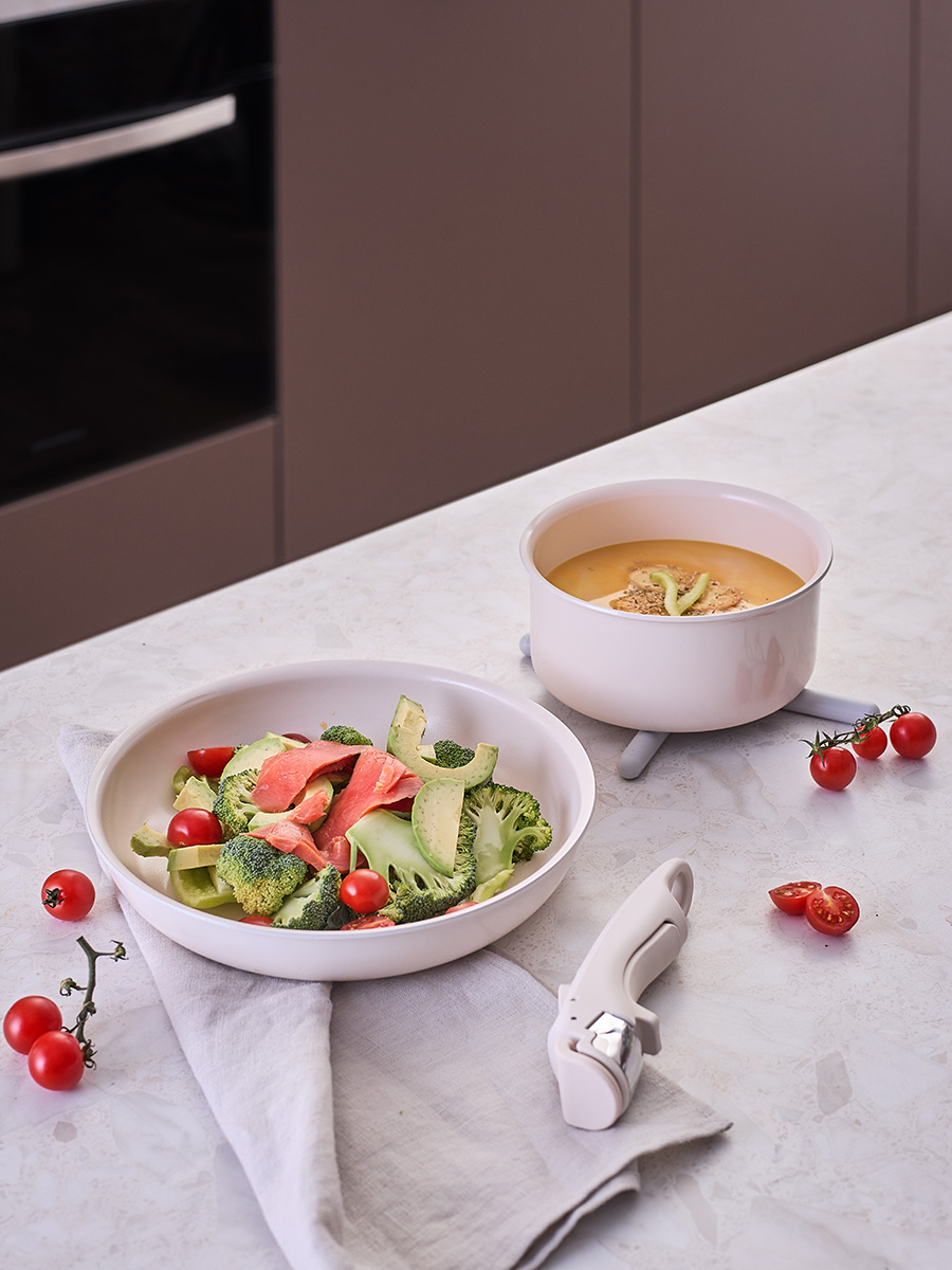 Набор Smart Ceramic – уникальное сочетание традиций и инноваций для тех, кто ценит качество и удобство на кухне. Посуда с керамическим покрытием позволяет приготовить вкусные и сочные блюда практически без добавления масла. Оригинальная округлая форма и съемная ручка делают использование и хранение максимально удобным – сковороды и ковш легко помещаются в холодильнике или на полке шкафа, экономя пространство, а их гладкая поверхность быстро очищается от любых загрязнений.