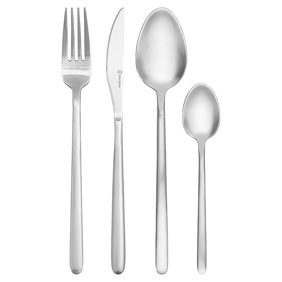 Материалы: нержавеющая сталь 430 (18/0). Длина ножа: 23,5 см. Вес ножа: 68 г. Длина вилки: 21 см. Вес вилки: 54,5 г. Длина ложки: 21,5 см. Вес ложки: 65 г. Длина чайной ложки: 15 см. Вес чайной ложки: 24,5 г. Цвет: серебристый. Полировка: матовая. Количество предметов в наборе: 24 шт.