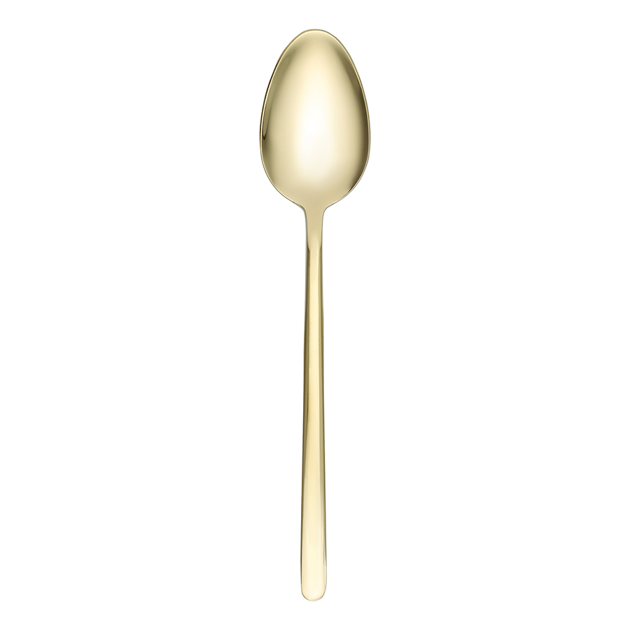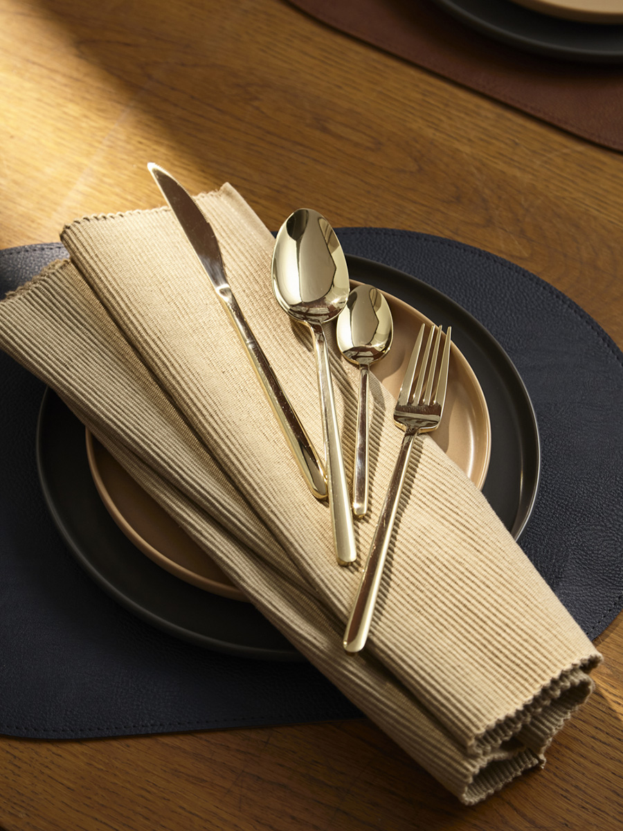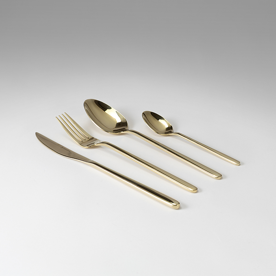- Столовые приборы золотистого цвета с зеркальной полировкой идеально вписываются в классическую и традиционную сервировку, прекрасно сочетаясь с белоснежной скатертью и фарфоровой посудой. В современных решениях они могут служить ярким акцентом на фоне простых и лаконичных элементов.