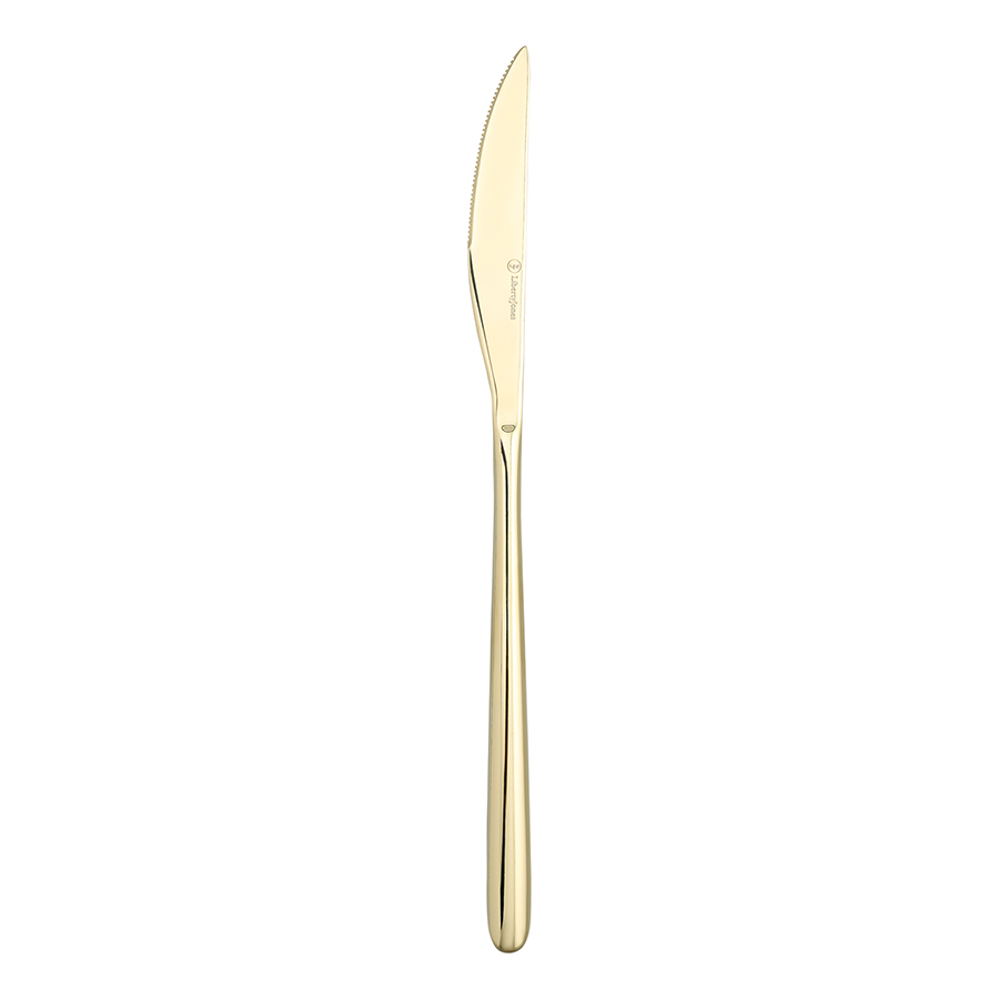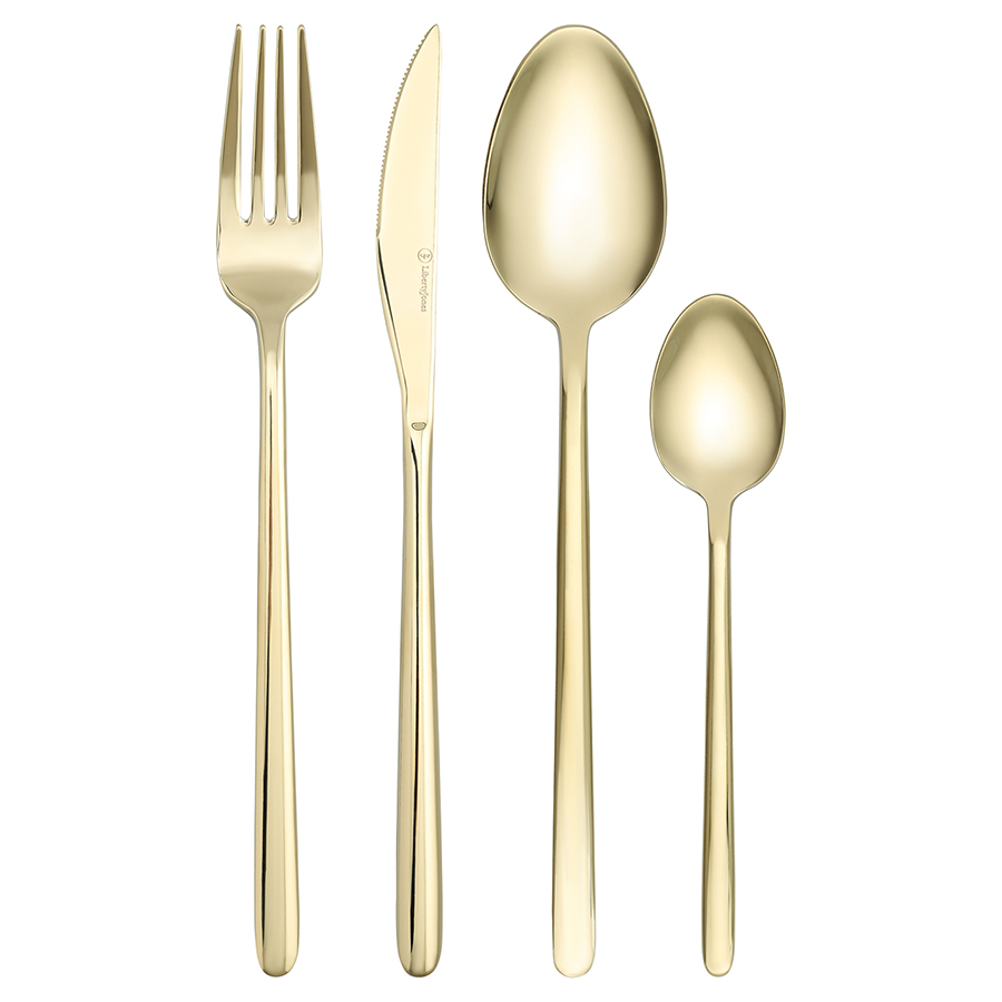 Материалы: нержавеющая сталь 430 (18/0). Длина ножа: 23,5 см. Вес ножа: 68 г. Длина вилки: 21 см. Вес вилки: 54,5 г. Длина ложки: 21,5 см. Вес ложки: 65 г. Длина чайной ложки: 15 см. Вес чайной ложки: 24,5 г. Цвет: золотистый. Полировка: зеркальная. Количество предметов в наборе: 24 шт.
