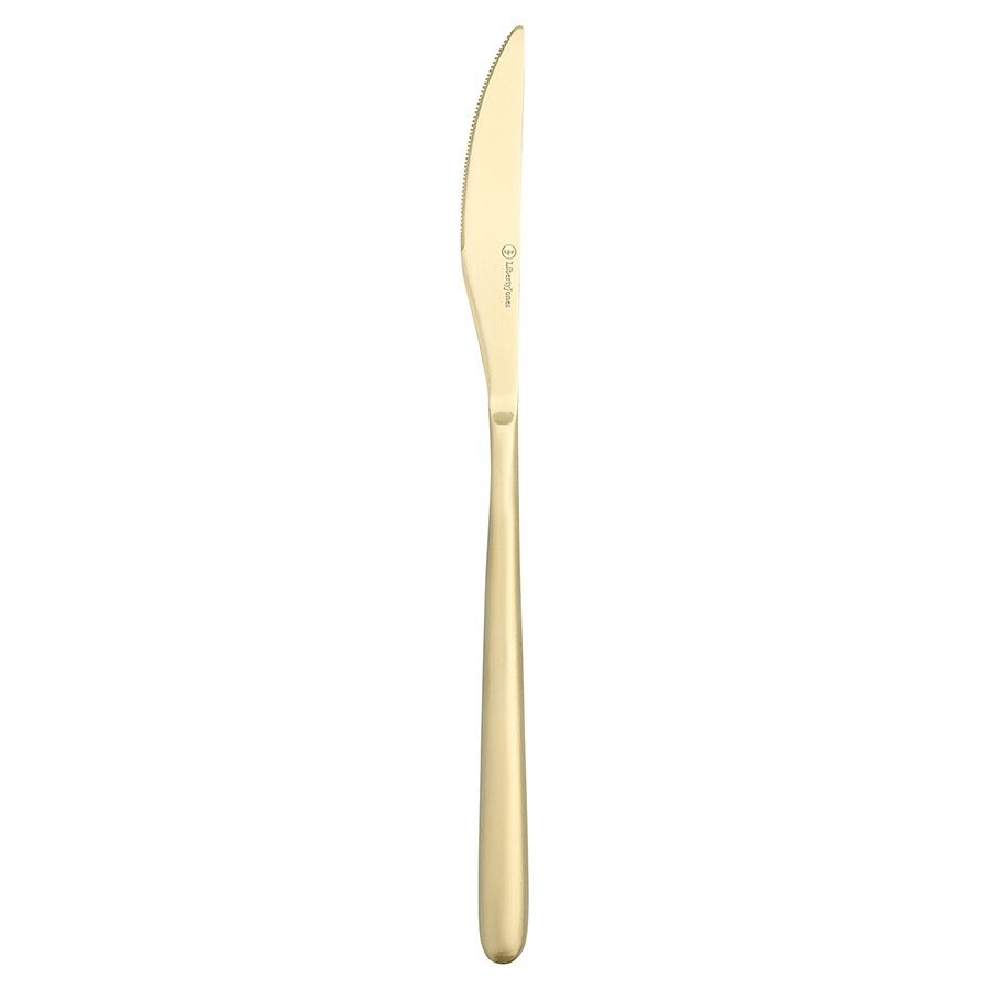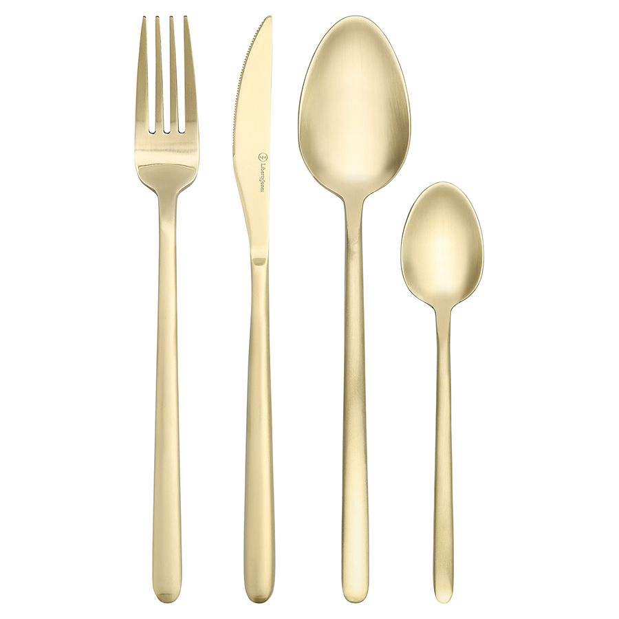 - Столовые приборы золотистого цвета с матовой полировкой отлично подойдут для сервировки в традиционном и современном стиле. Их сдержанная элегантность прекрасно гармонирует с простыми формами и нейтральными цветами.