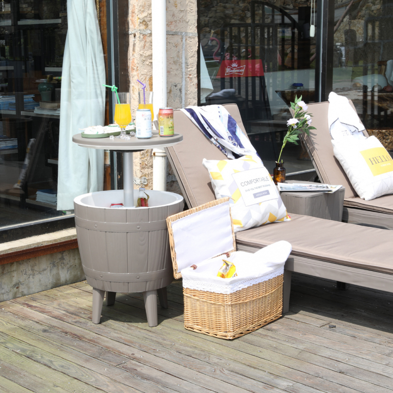 Функциональный столик Nova Cool Bar - это изделие 3-в-1. С закрытой крышкой его можно использовать как журнальный или кофейный столик, а с поднятой - как коктейльный бар и охладитель напитков. Удобное и стильное решение для барбекю и других мероприятий на открытом воздухе. Столик устойчив к любым негативным воздействиям атмосферы. Его можно оставлять на улице, не беспокоясь о коррозии и другом связанном с погодой ущербе. Особенности: Коктейльный бар, охладитель напитков и журнальный столик - всё в одном. Модный дизайн "под дерево" сочетается с любым декором садовой мебели. Материал - полипропилен, труба из алюминия, зажим из ABS-пластика. Поддержание крышки на опоре на высоте 250 мм. Кулер емкостью 37 л сохраняет напитки ледяными в течение нескольких часов. Встроенное дренажное отверстие с пробкой. Простота сборки и обслуживания. Подходит для улицы и помещения. Габариты: Размеры: Ø485х575 мм. Высота столика может устанавливаться в 2-х положениях: 575 мм и 821 мм. Размеры упаковки: 500х500х435 мм. Вес столика, нетто: 6 кг. Вес столика в упаковке, брутто: 7.9 кг. Объем упаковки: 0.11 м3. Возможные цвета: тортора+белый, черный+белый, индивидуальные цвета по запросу. Открыть инструкцию по уходу.