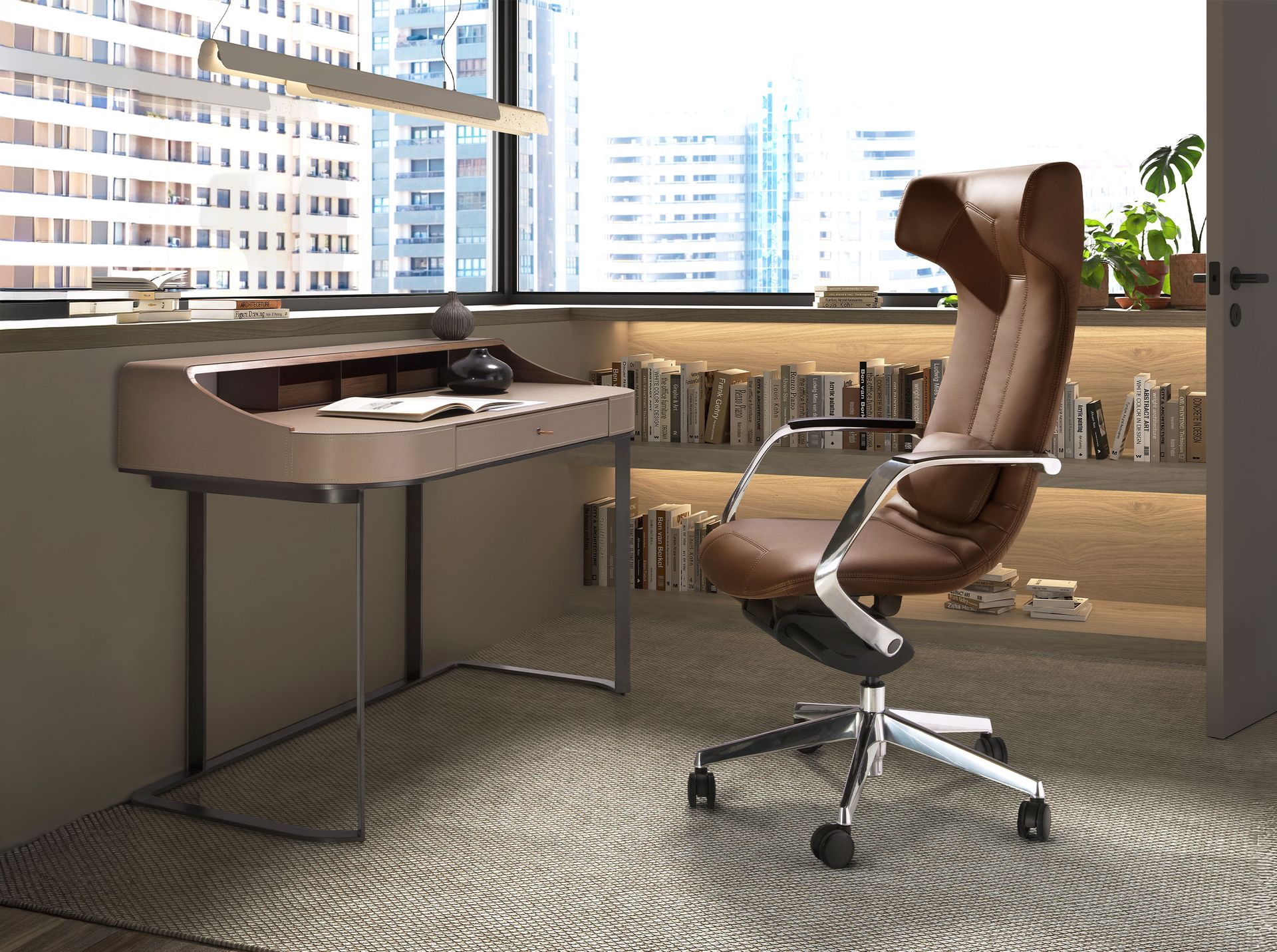 Современное поворотное офисное кресло с сиденьем и спинкой, обитыми коричневой искусственной кожей. Оно оснащено подлокотниками для большего комфорта. Благодаря ножкам из хромированной нержавеющей стали и регулируемой по высоте спинке, оно станет незаменимым элементом вашего рабочего места, не жертвуя при этом самым авангардным стилем. Колесики обеспечивают дополнительную практичность, необходимую во время работы или учебы.