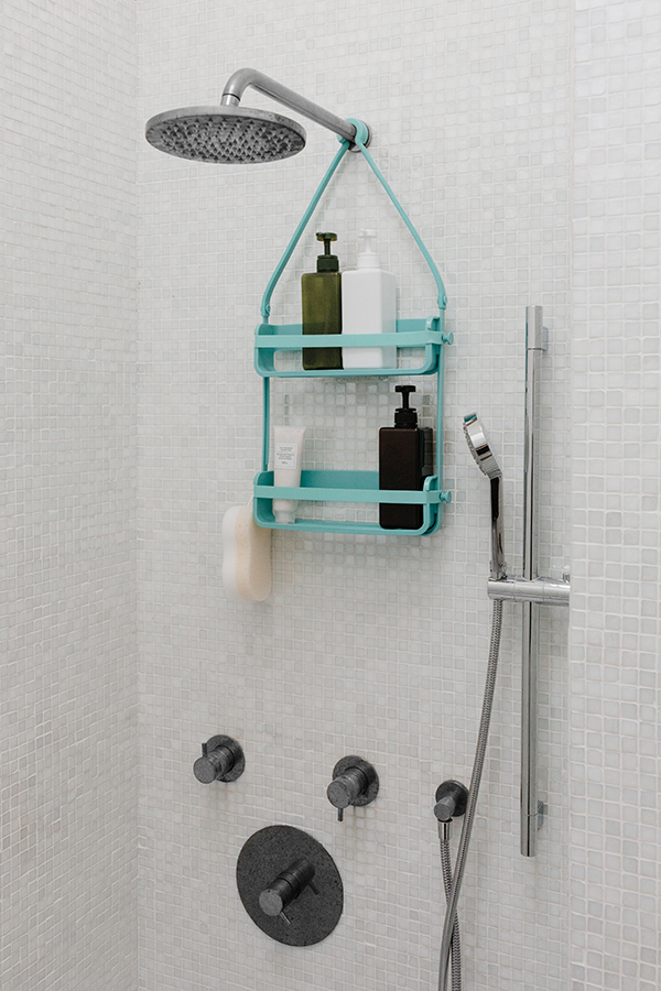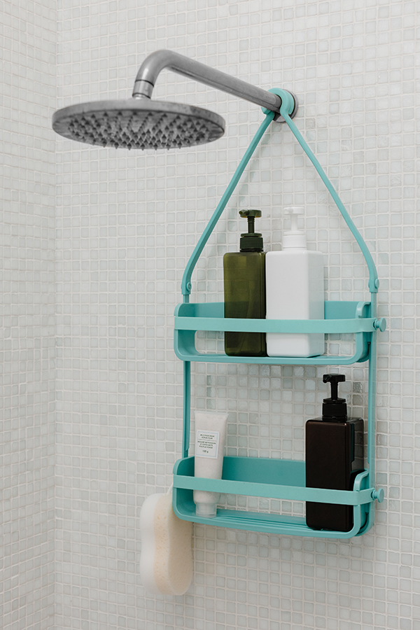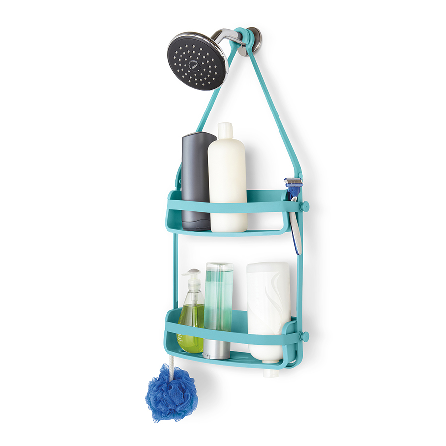 Органайзер Flex был разработан, чтобы вместить максимум вещей на минимальном пространстве. Прочная основа держит вес всех флаконов (до 3,5 кг), а гибкие силиконовые ленты со специальными крючками на концах позволяют повесить органайзер на крепление для душа или штангу для шторки в ванной. На двух полках помещаются даже очень большие флаконы с шампунем. В каждой проделано отверстие, чтобы перевернув пузырек вверх ногами, вы использовали его как диспенсер (что удобно, когда средство заканчивается). Плюс специальное место для мыла, и пространства по краям, чтобы поместить бритву и подвесить мочалку.