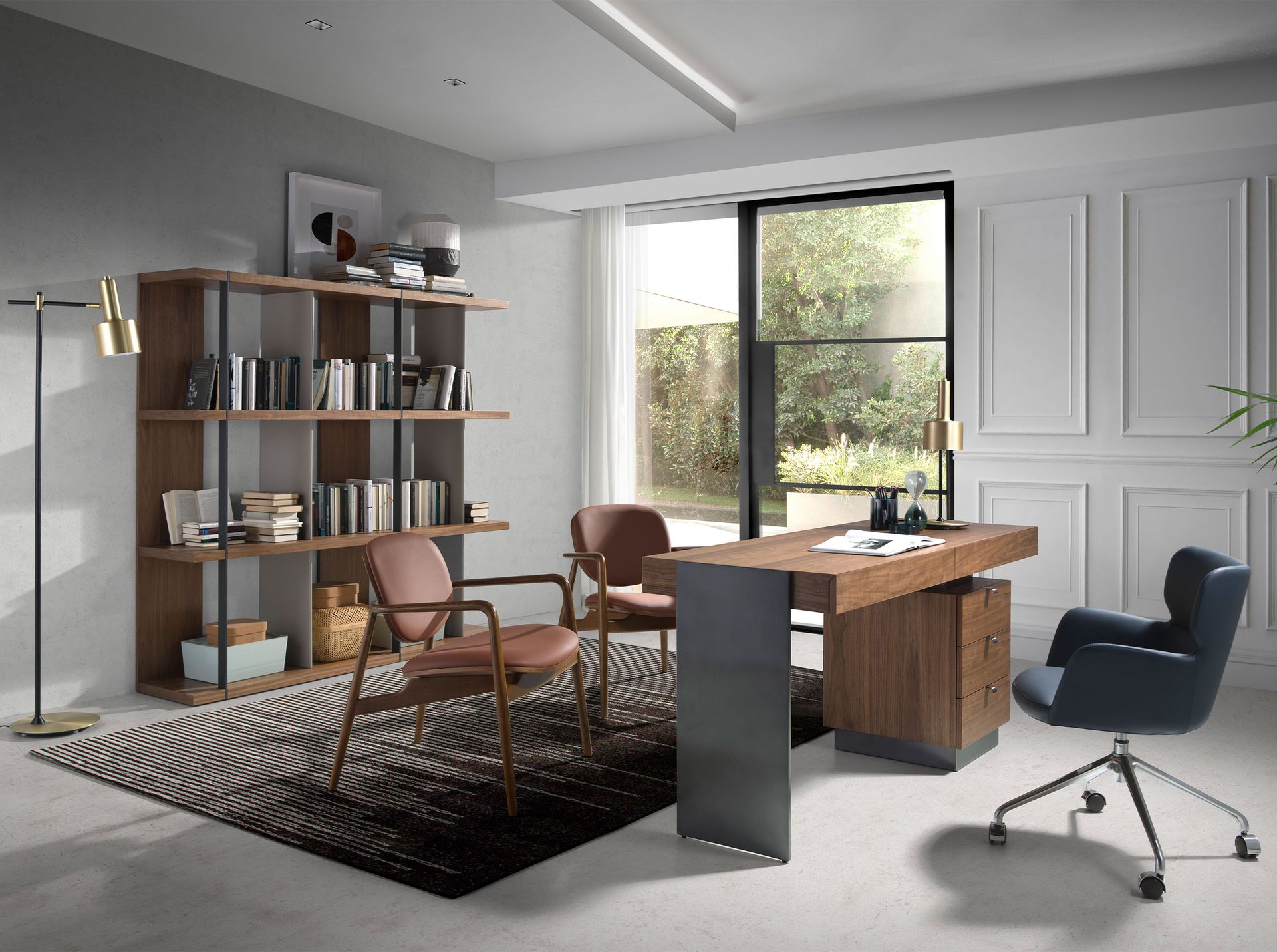 Офисный стол со столешницей и тумбой из шпона орехового дерева. Структура ножек и детали из твердой полированной нержавеющей стали.