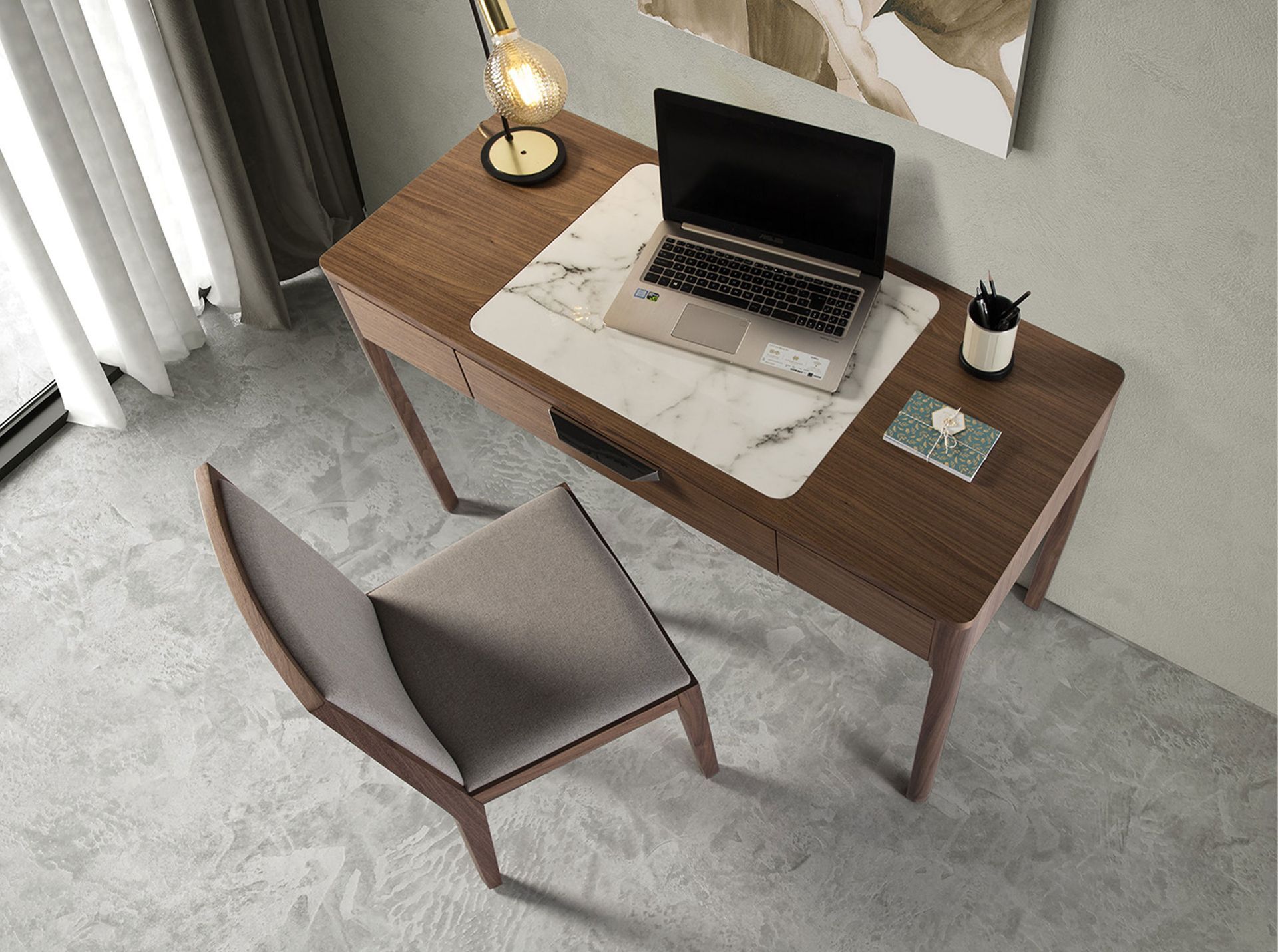 Письменный стол CP1806-DK от Angel Cerda — традиционное в современном и неожиданное сочетание материалов. Особенность этой модели видно сразу и невооруженным взглядом. Она удивляет и впечатляет. Это керамическая накладка в самом центре деревянной столешницы. Такое смелое дизайнерское решение получилось оправданным — стол выглядит необычно и, в то же время, гармонично. Стол имеет традиционную прямоугольную форму. Он полностью выполнен из дерева.