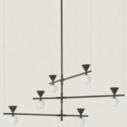 Люстра состоит из сварной металлической конструкции с трубчатой структурой и шести абажуров из мрамора и стекла.