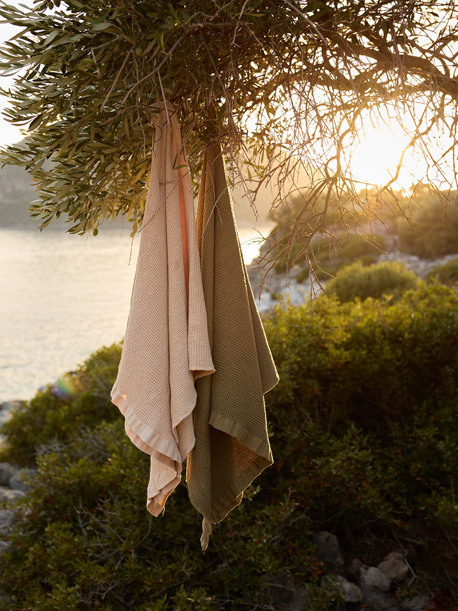 - Благодаря вафельному плетению материал хорошо пропускает воздух, быстро сохнет и отличается легкостью.