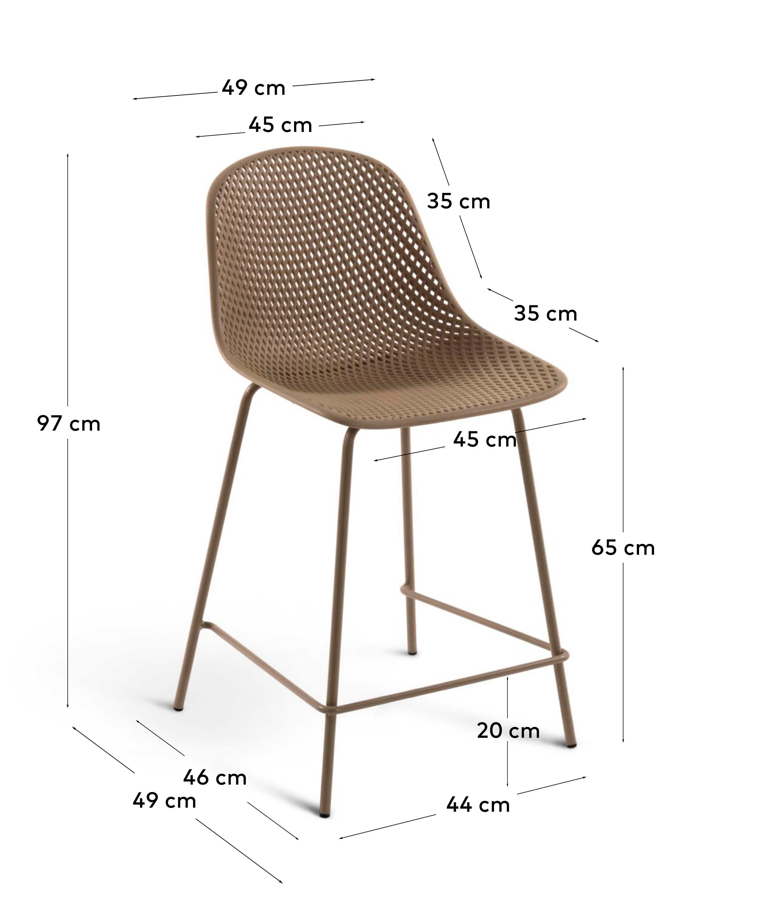Полубарные стулья Quinby от La Forma — современный дизайн, практичность, универсальность. При взгляде на эту коллекцию, сразу ловишь себя на мысли о том, как легко можно обставить интерьер барной зоны без крупных вложений. Стулья представлены разной высоты — барные и полубарные, в четырех цветах. Они эргономичны и современны, под них не нужно переделывать интерьер — и это факт. Стул конструкционно состоит из двух элементов — металлической опоры с четырьмя ножками и цельного сиденья. Оно имеет анатомическую форму внутри и обтекаемую снаружи, что эргономично и эстетично. Материал изготовления — пластик. Этот материал прочный, эргономичный, легкий. Сетчатая фактура добавляет оригинальности, выделяет среди похожих пластиковых моделей. Опора крепится на четырех болтах к тыльной стороне сиденья. Она металлическая, окрашена в тот же цвет, что и сиденье. Прочность металла гарантирует стойкость к высоким весовым нагрузкам. Дополнительный комфорт и устойчивость обеспечивает поперечная перекладина, проходящая по всему периметру опоры. В коллекции — изделия желтого, черного, белого и бежевого цвета.