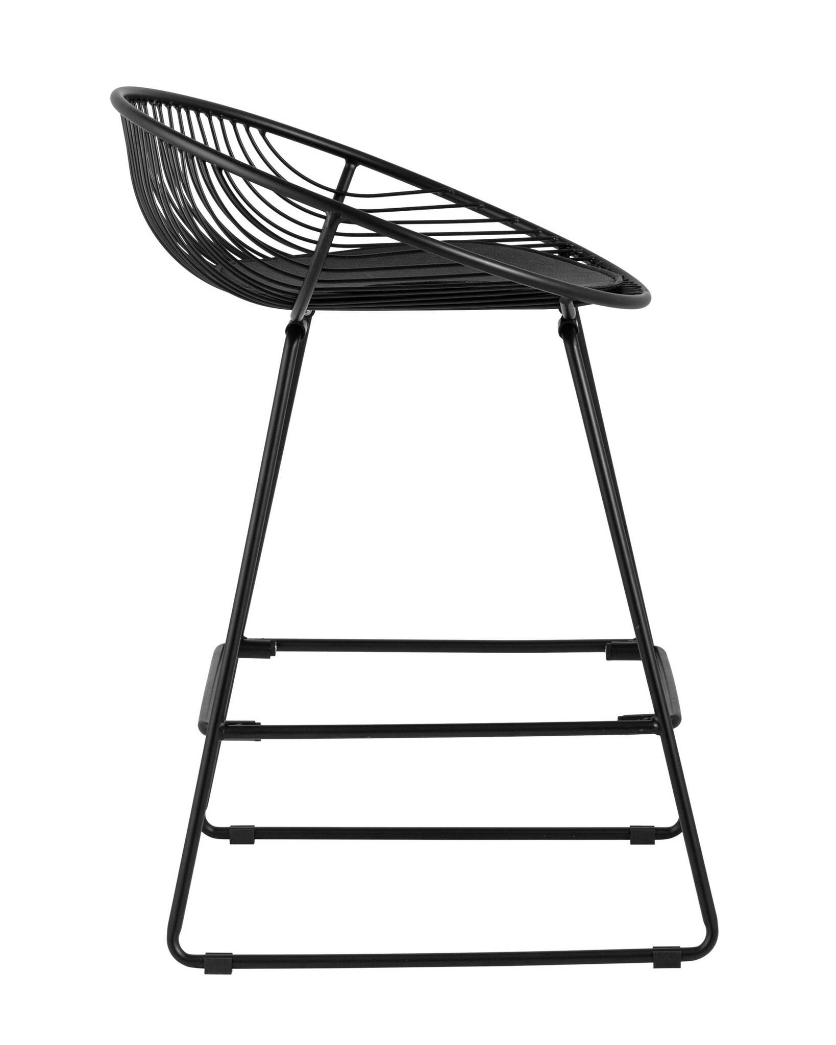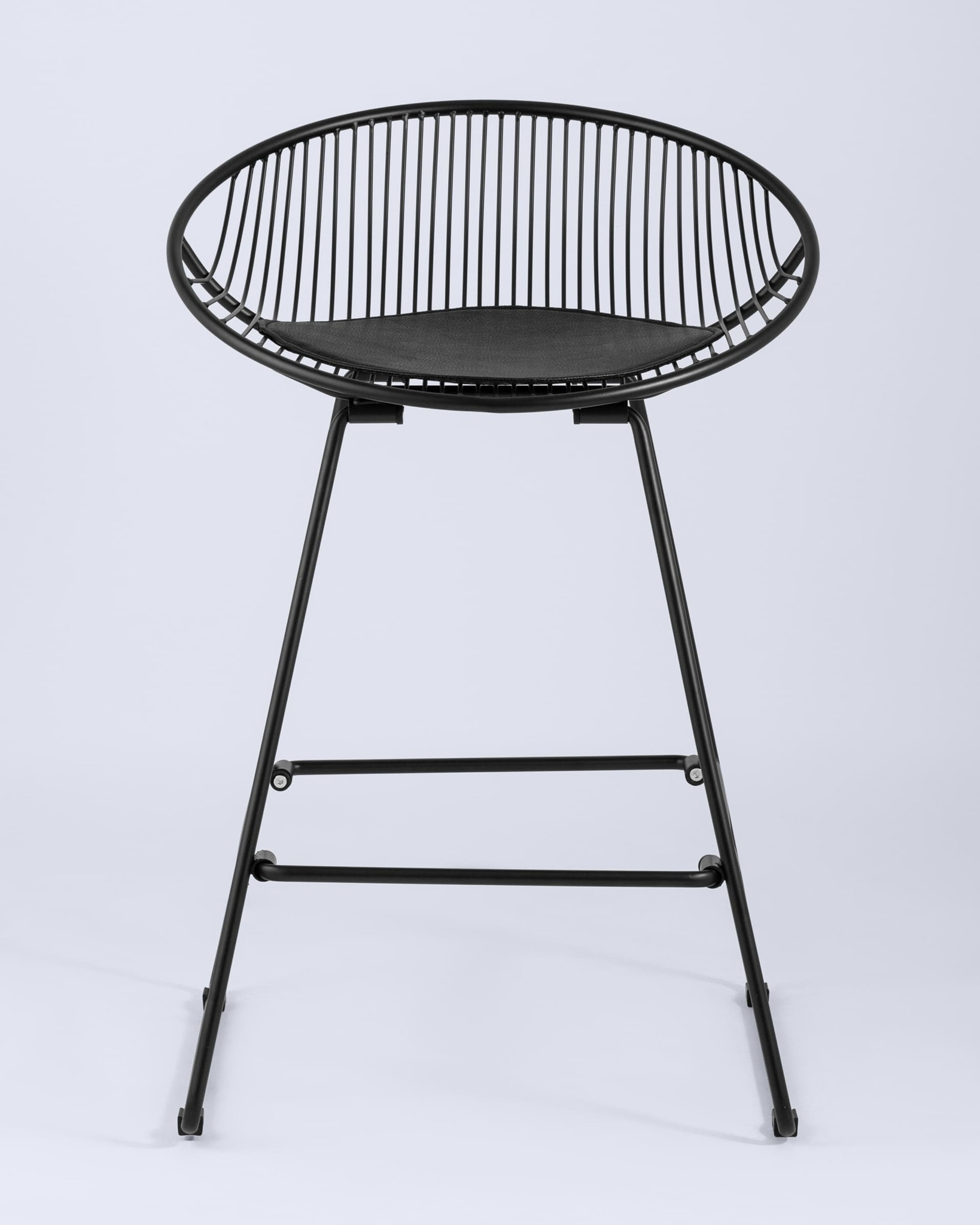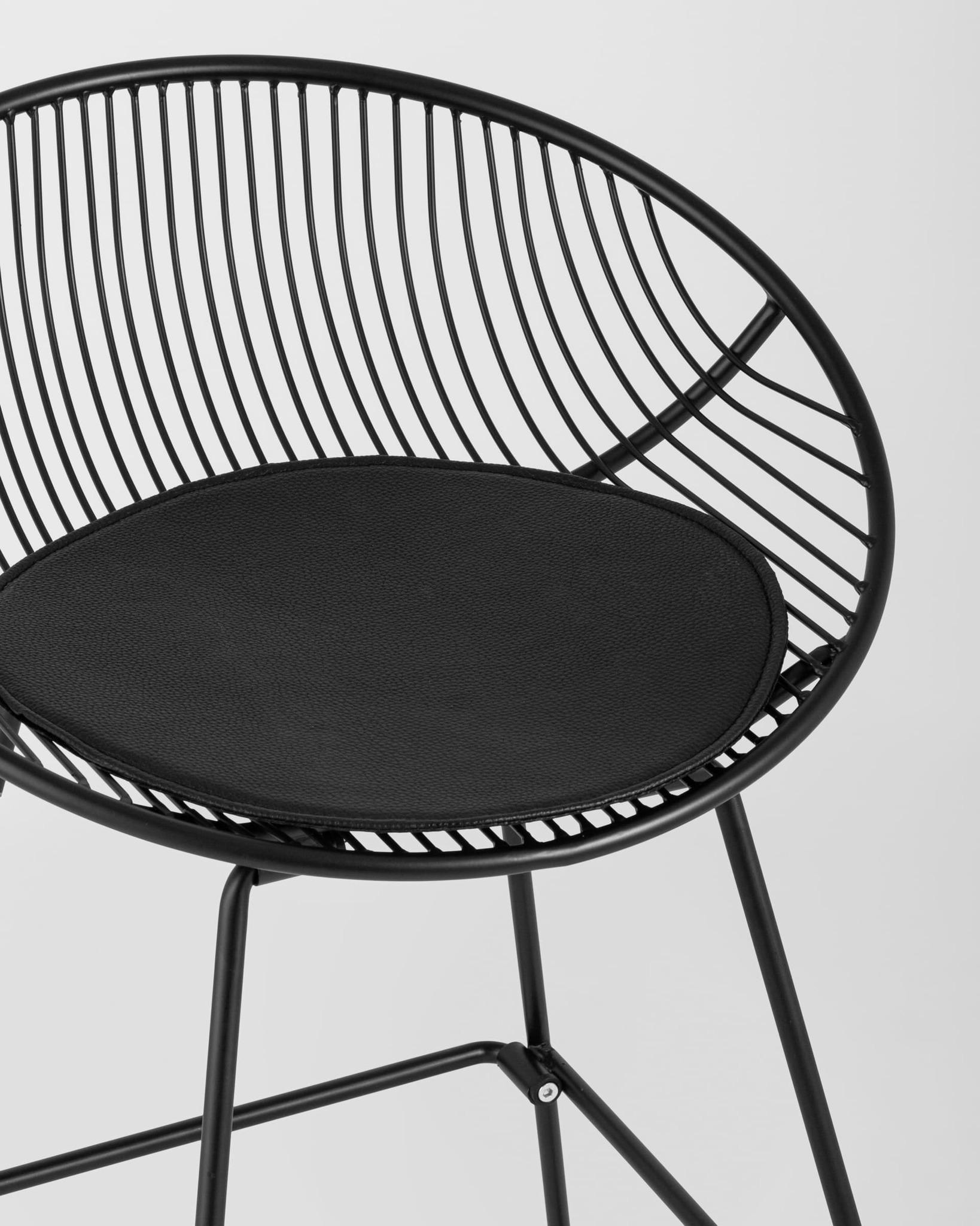 Необычный дизайн барного стула Ufo станет акцентом интерьера кухни в современном стиле. Спинка и сидение выполнены из металлических прутьев черного цвета. Подушка изготовлена из черной экокожи. Ножки выполнены из металла в тон сидения и имеют подставки, которые предотвращают скольжение стула по поверхности пола.