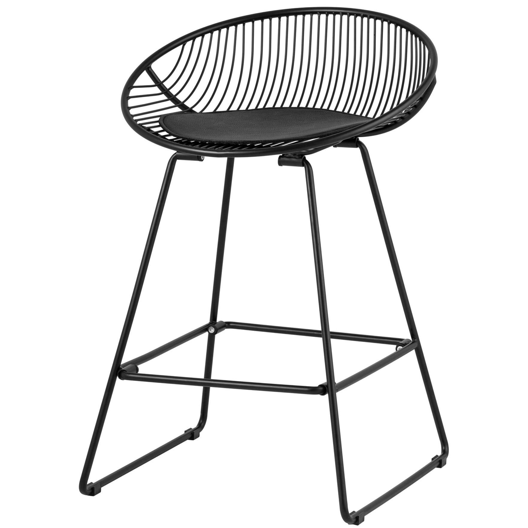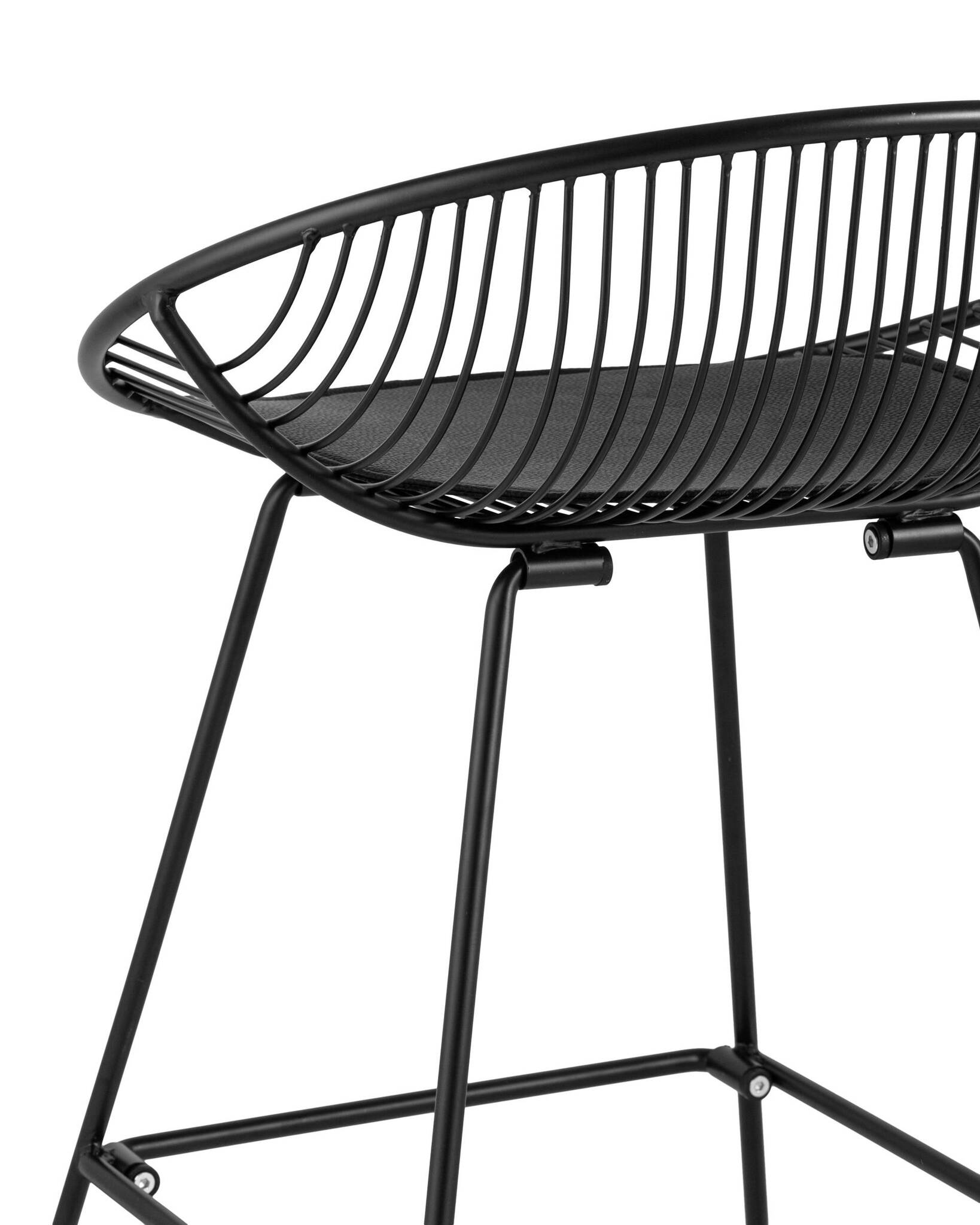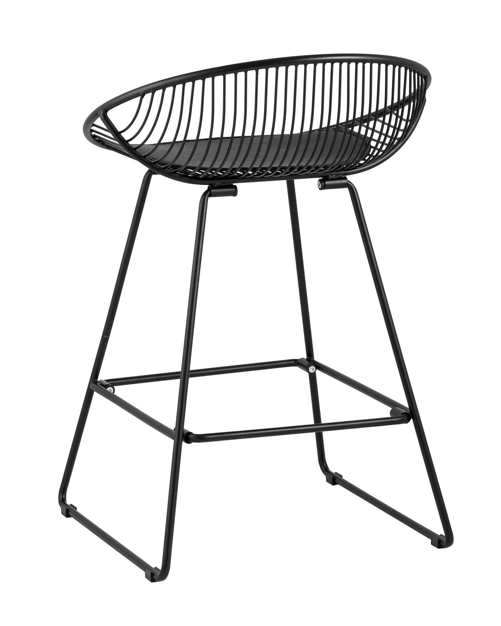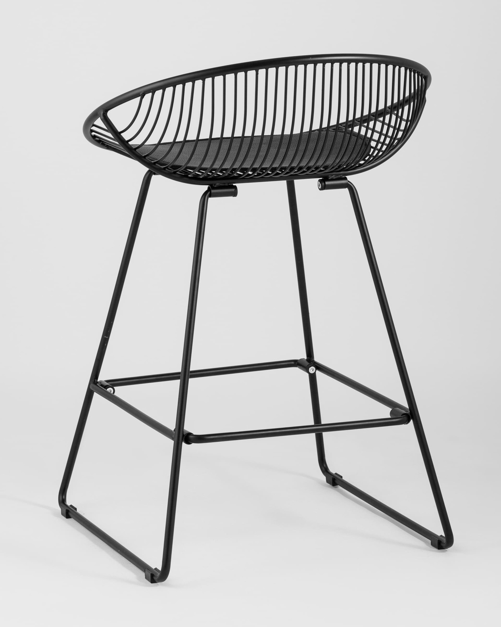 Необычный дизайн барного стула Ufo станет акцентом интерьера кухни в современном стиле. Спинка и сидение выполнены из металлических прутьев черного цвета. Подушка изготовлена из черной экокожи. Ножки выполнены из металла в тон сидения и имеют подставки, которые предотвращают скольжение стула по поверхности пола.