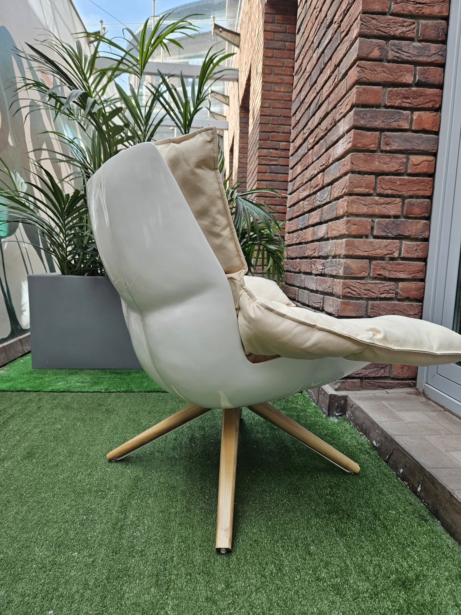 Кресло выполнено из высококачественного стекловолокна, обеспечивающего прочность и долговечность конструкции. Плавные формы каркаса покрыты мягкой, приятной на ощупь тканью, которая приглашает расслабиться и отдохнуть. Высота сидения в 45 см идеально подходит для комфортного размещения, облегчая вставание и садку.