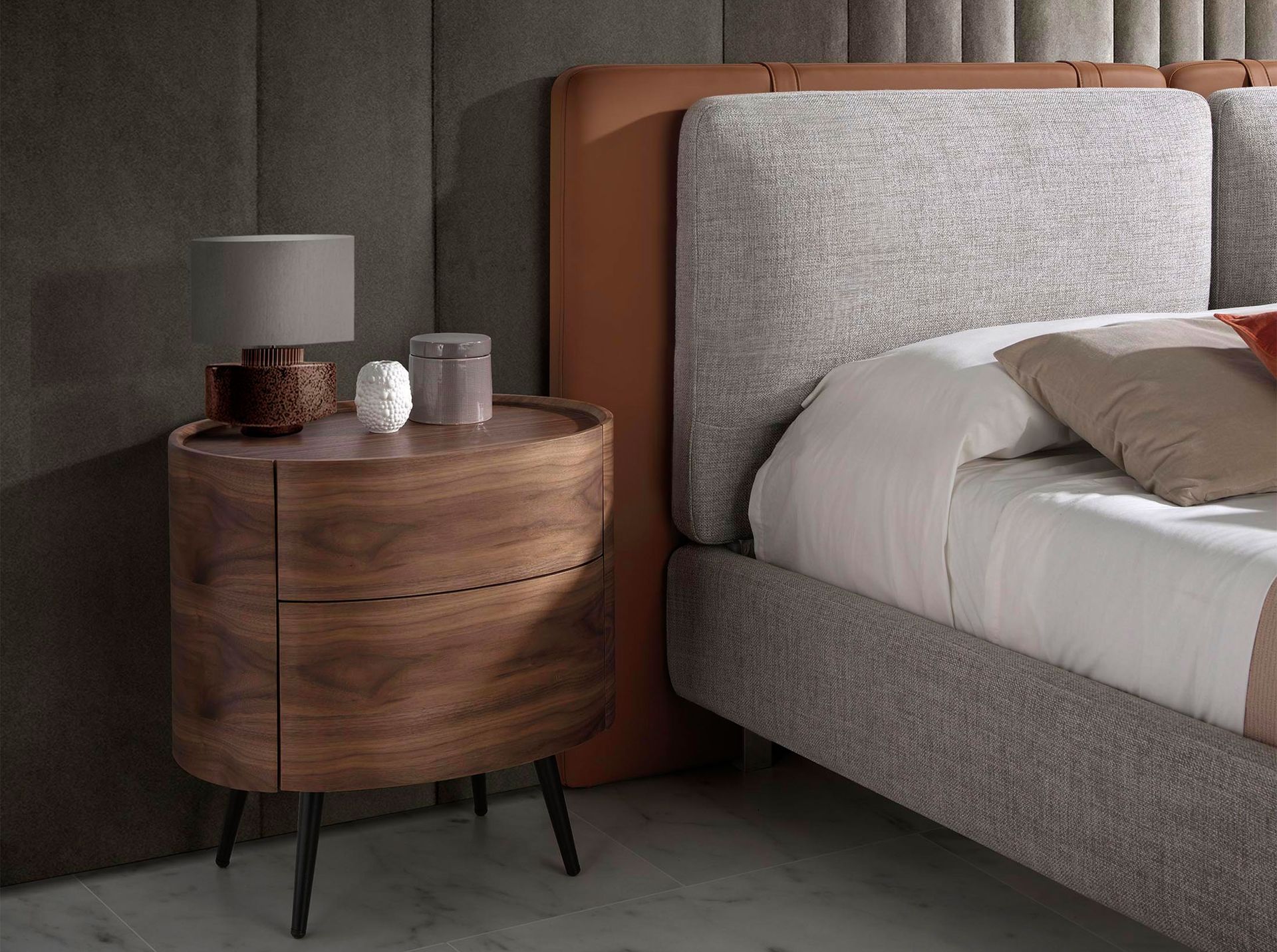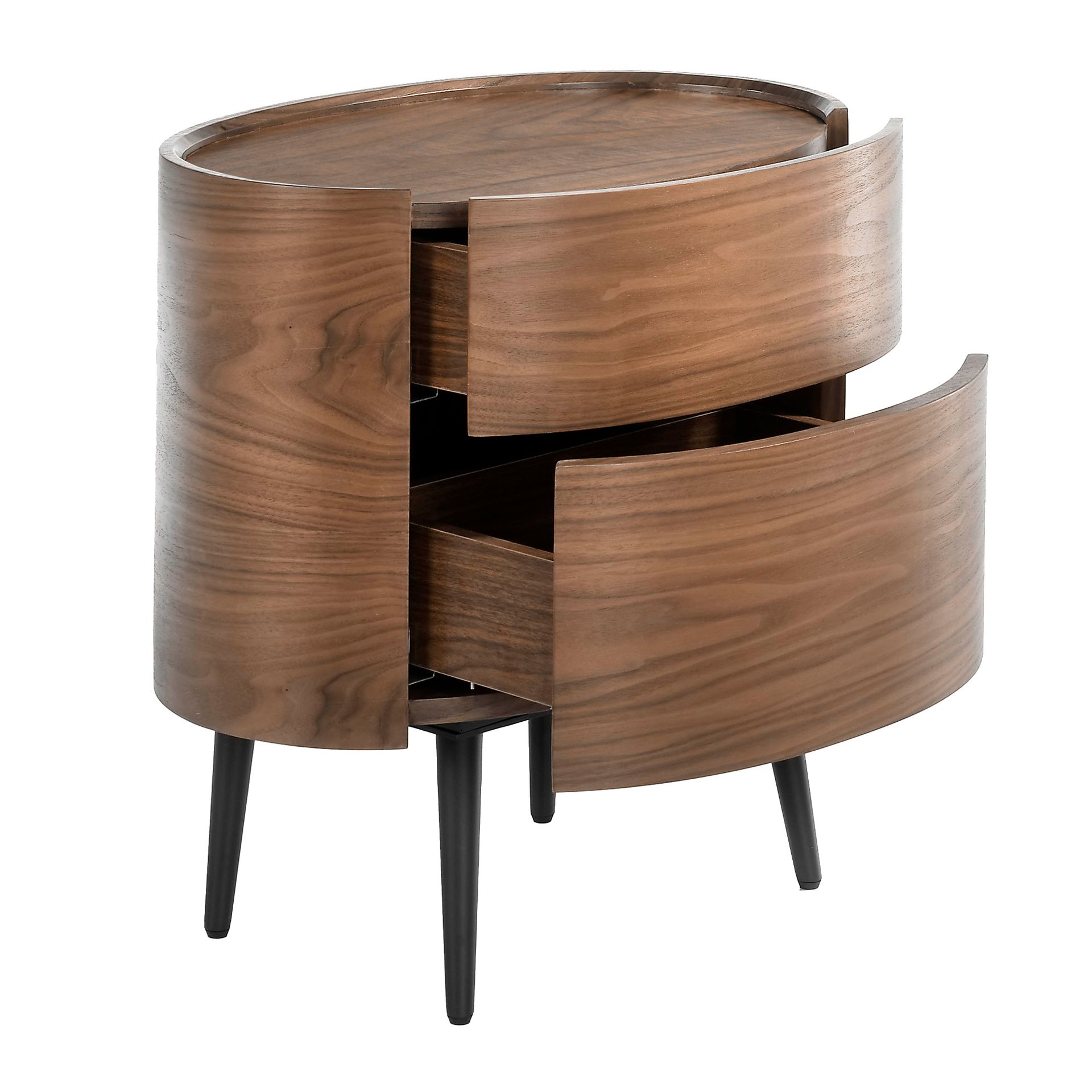 Овальная прикроватная тумба из дерева, шпонированного орехом, с 2 потайными ящиками. Деревянные ножки окрашены в черный цвет.