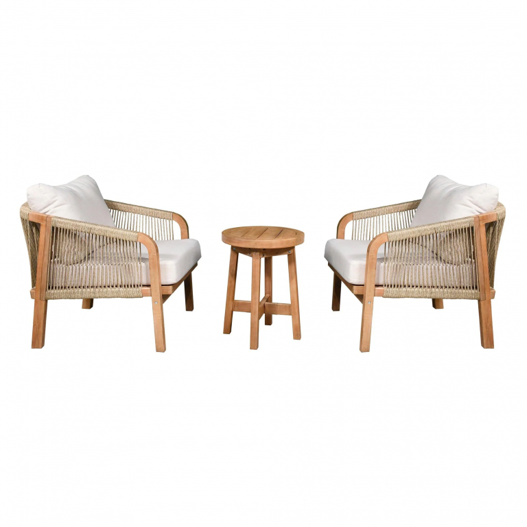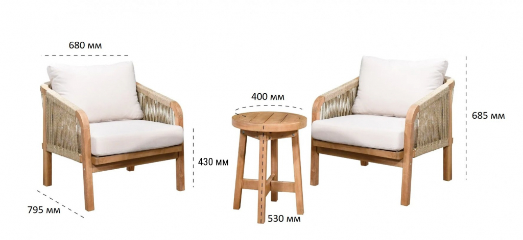 Лаунж группа Ravona, рассчитанная на 2 персоны, - это садовая мебель из АКАЦИИ в современном стиле. Дизайнерские формы мебели из этой коллекции создадут стильный и узнаваемый облик зоны отдыха на Вашей веранде. Ravona - это современная коллекция садовой мебели из акации, выполненная в комбинации натурального веревочного плетения роуп, акации и бежевых подушек. Цвет натуральной твердой древесины представляет собой натуральный цвет с мелкой текстурой, придающий древесине приятный теплый вид. Ravona - это стиль и элегантность на Вашей веранде. Особенности: Материал - АКАЦИЯ, отделка экомаслом тик Light #01A. Веревочное плетение роуп 6 мм толщиной на спинке и подлокотниках кресел излучает стиль в сочетании с деревянными поверхностями. Древесина, из которой изготовлена мебель, имеет сертификацию FSC (Forest Stewardship Council) - гарантия качества и происхождения древесины. Знак FSC - показатель того, что продукция происходит из леса, в котором ведется экологически и социально ответственное лесное хозяйство. Благодаря своей долговечности, прочности и устойчивости к вредителям эта древесина была создана для изготовления садовой мебели. Страна происхождения древесины: Вьетнам, Малайзия. Средняя плотность древесины: 550 кг/м3. Анодированная фурнитура из нержавеющей стали. Подушки в комплекте, ткань подушек - олефин, наполнитель - толстый поролон. Материалы устойчивы к УФ-излучению и другим погодным воздействиям. Цвет подушек - бежевый. Состав комплекта: Кресло Ravona KD (Арт. TAG/HUC25687KD), размер 680х795х685 мм - 2 шт. Кофейный стол Ravona (Арт. TAG/HUC28187), размер 1275х650х360 мм - 1 шт. Данные упаковки: 2 кресла: Вес нетто: 15 кг. Вес брутто: 35 кг. Размер упаковки: 830х790х655 мм. Кофейный стол: Вес нетто: 5 кг. Размер упаковки: 535х440х125 мм. Открыть инструкцию по уходу. Вся деревянная мебель должна обрабатываться специальным маслом или пропиткой минимум 1 раз в 6 месяцев (в условиях высокой влажности обработку следует проводить чаще). Для данной мебели не рекомендуются резкие температурные перепады. Мебель из дерева акации должна использоваться только под навесом. Дерево является натуральным материалом, поэтому любые трещины, неравномерные природные рисунки, различность оттенков ‐ являются естественным процессом, который вызван температурными изменениями или влажностью.