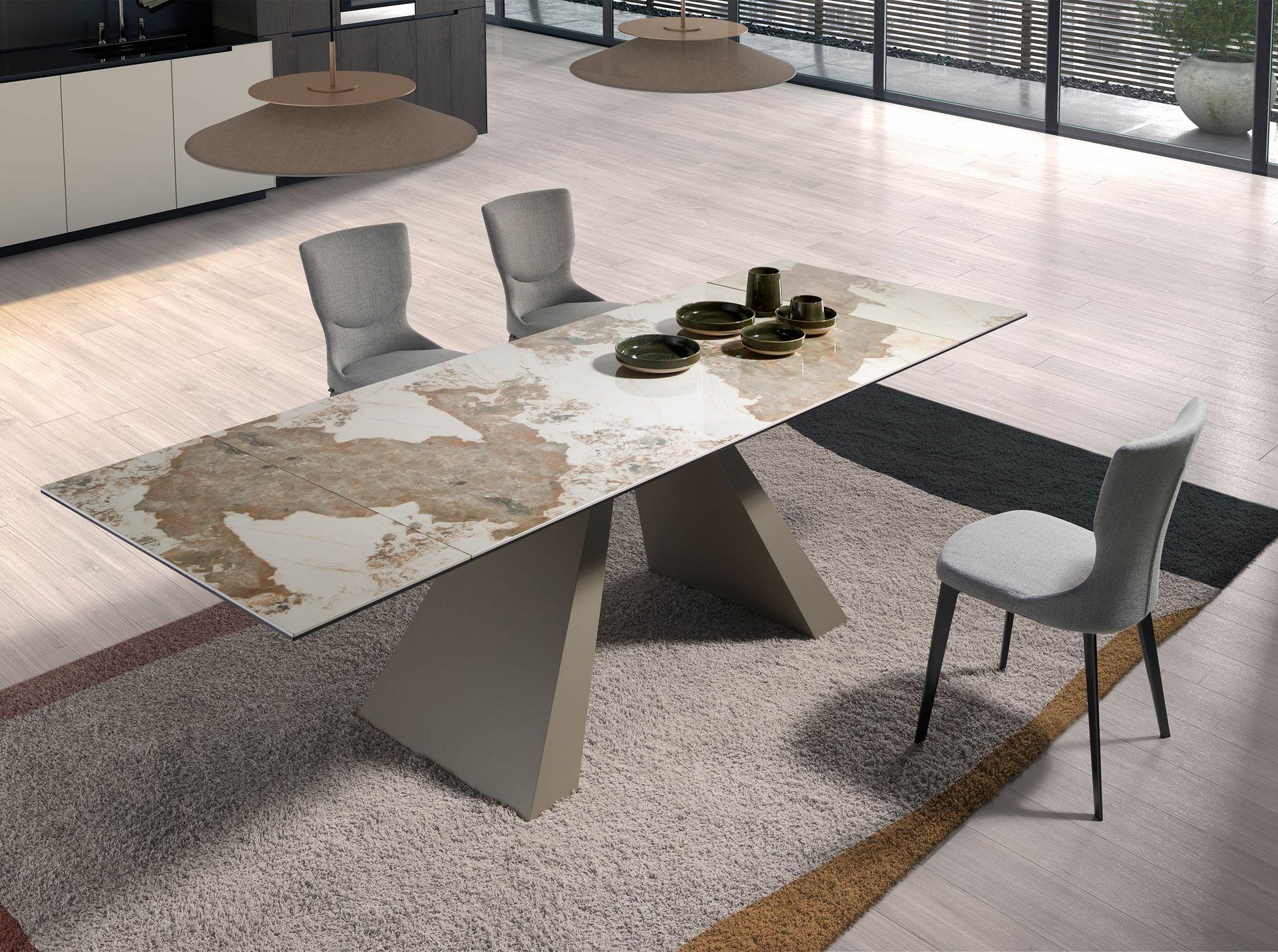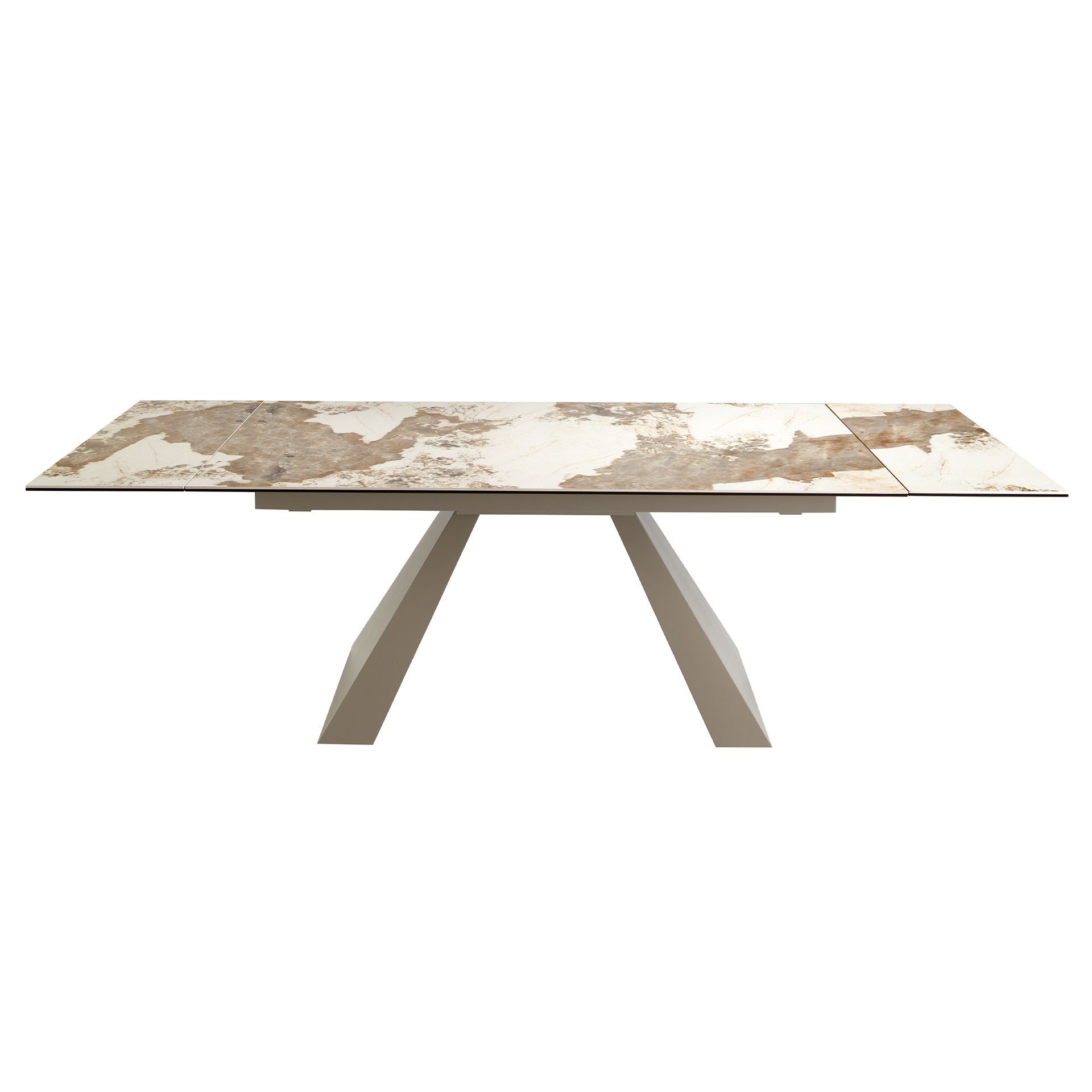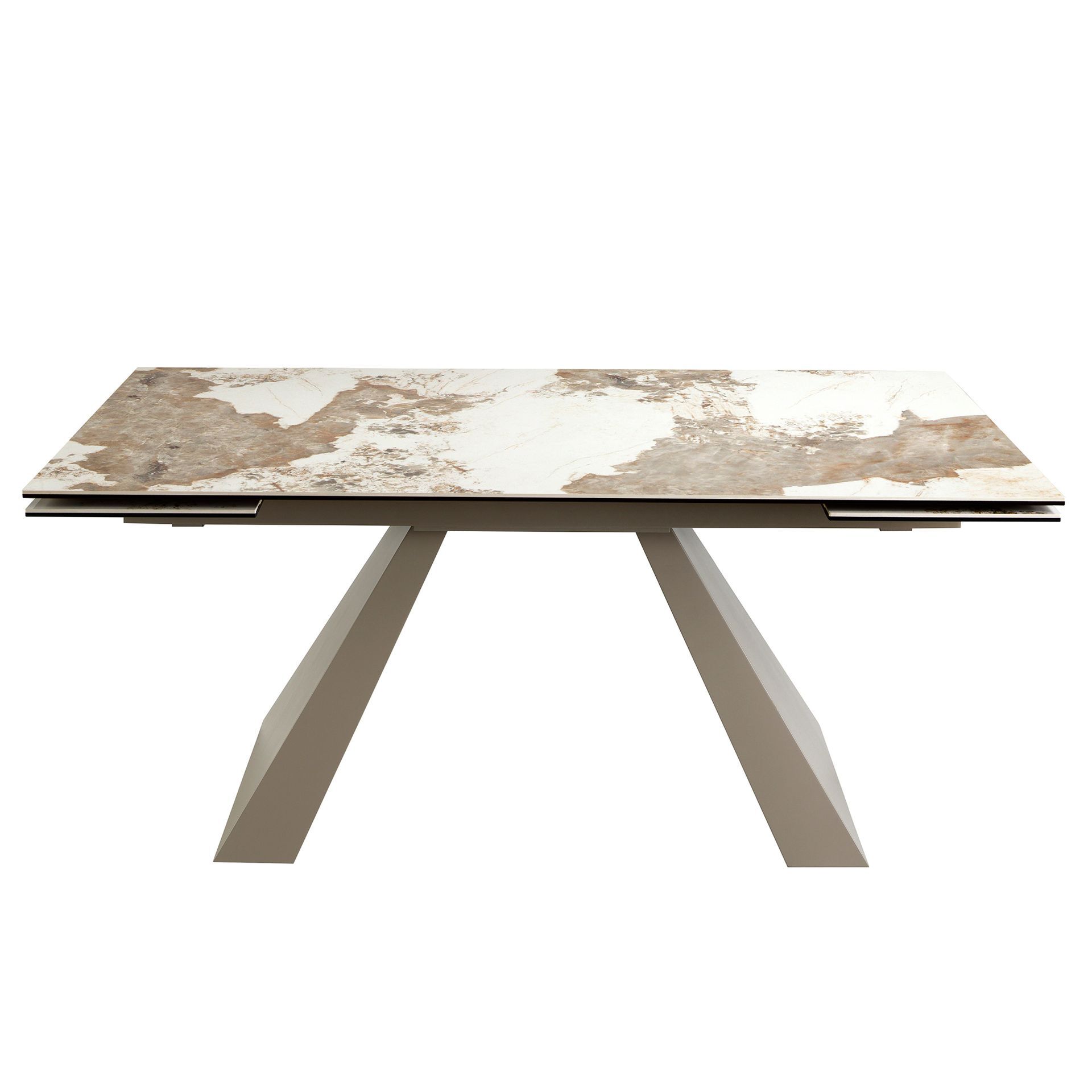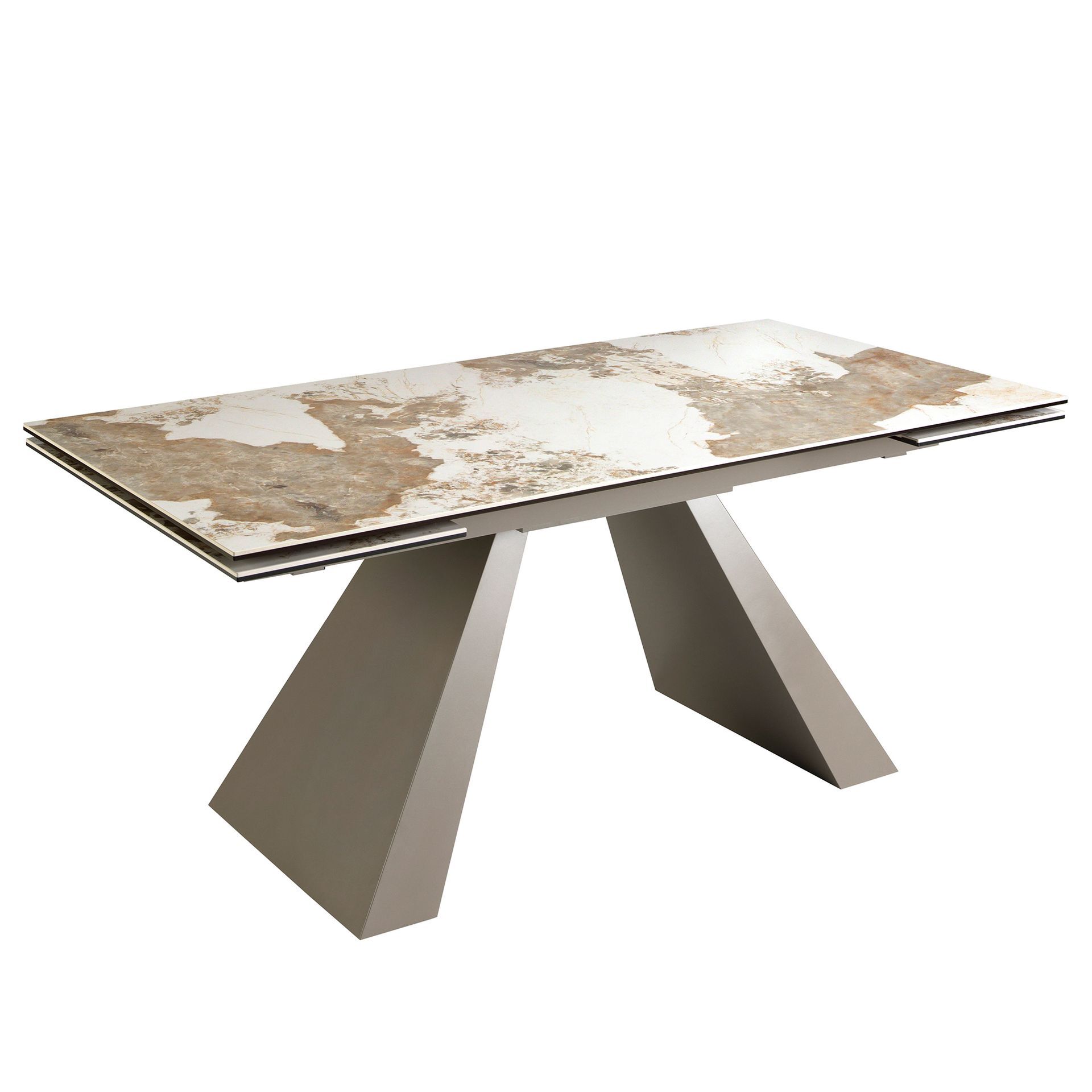 Современный дизайн прямоугольный выдвижной обеденный стол с белой фарфоровой мраморной столешницей с земляными прожилками в глянцевой отделке. Его ножки из нержавеющей стали, окрашенные в цвет шампанского, а также его адаптивность делают его полностью функциональным и универсальным предметом мебели для повседневного использования.