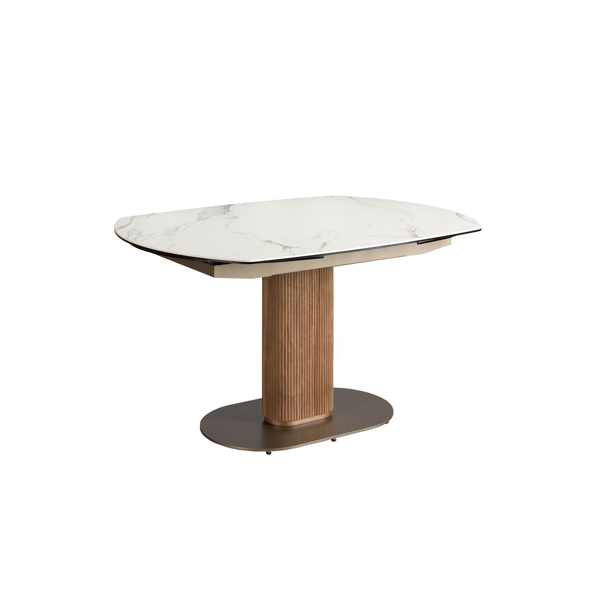 Раздвижной овальный обеденный стол-бочка с современным дизайном, столешницей из белого фарфорового мрамора с серыми и коричневыми прожилками в глянцевой отделке. Его деревянные ножки цвета ореха, вместе с основанием из нержавеющей стали цвета шампанского, а также его адаптивность делают его полностью функциональным и универсальным предметом мебели для повседневного использования.