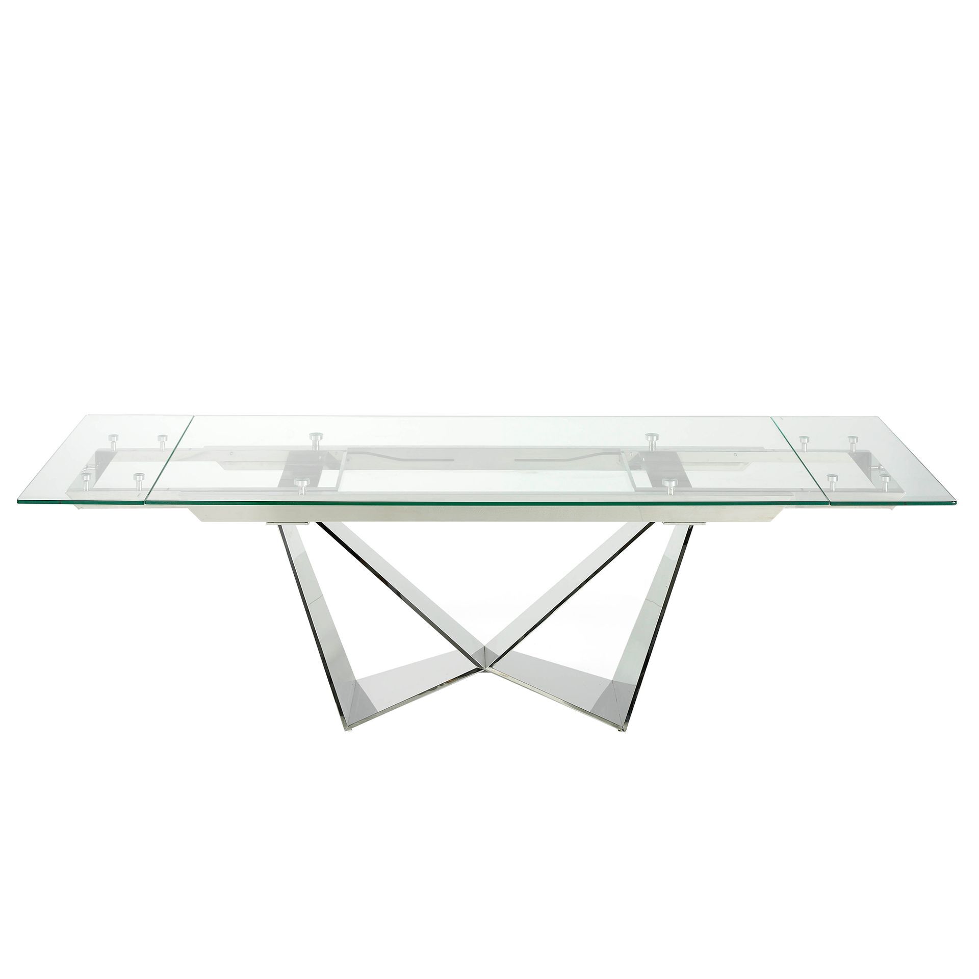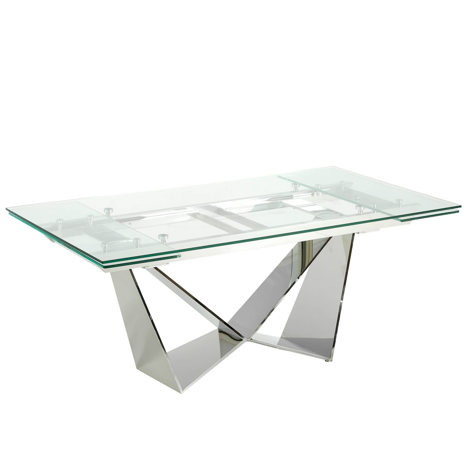 Стол сделан из хромированной стали и наделен раздвижной стеклянной столешницей. Благодаря реечному механизму удлинения, увеличить габариты стола просто и быстро — достаточно выдвинуть с обеих сторон дополнительные секции (они также видны под стеклом столешницы).