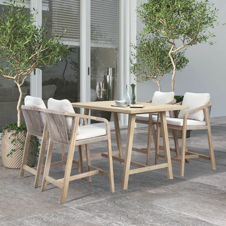 Барная группа Rimini, рассчитанная на 4 персоны, - это садовая мебель из АКАЦИИ в современном стиле. Дизайнерские формы мебели из этой коллекции создадут стильный и узнаваемый облик зоны отдыха на вашей веранде. Rimini - это современная коллекция садовой мебели, выполненная в комбинации натурального веревочного плетения роуп, акации и бежевых подушек. Цвет натуральной твердой древесины представляет собой натуральный цвет с мелкой текстурой, придающий древесине приятный теплый вид. Rimini - это стиль и элегантность на Вашей веранде. Состав комплекта: Барный стол, размер: 1560х900х950 мм - 1 шт. Полубарное кресло, размер: 550х680х975 мм, высота сиденья: 650 мм - 4 шт. Особенности: Материал - АКАЦИЯ, отделка экомаслом тик Light #01A. Веревочное плетение роуп 6 мм толщиной на спинке и подлокотниках кресел излучает стиль в сочетании с деревянными поверхностями. Древесина, из которой изготовлена мебель, имеет сертификацию FSC (Forest Stewardship Council) - гарантия качества и происхождения древесины. Знак FSC - показатель того, что продукция происходит из леса, в котором ведется экологически и социально ответственное лесное хозяйство. Благодаря своей долговечности, прочности и устойчивости к вредителям эта древесина была создана для изготовления садовой мебели. Страна происхождения древесины: Вьетнам, Малайзия. Средняя плотность древесины: 550 кг/м3. Анодированная фурнитура из нержавеющей стали. Подушки в комплекте, ткань подушек - олефин, наполнитель - толстый поролон. Материалы устойчивы к УФ-излучению и другим погодным воздействиям. Цвет подушек - бежевый. Высокая спинка, удобная подставка для ног и наклонный подлокотник обеспечивают оптимальную поддержку. Инструкция по уходу.