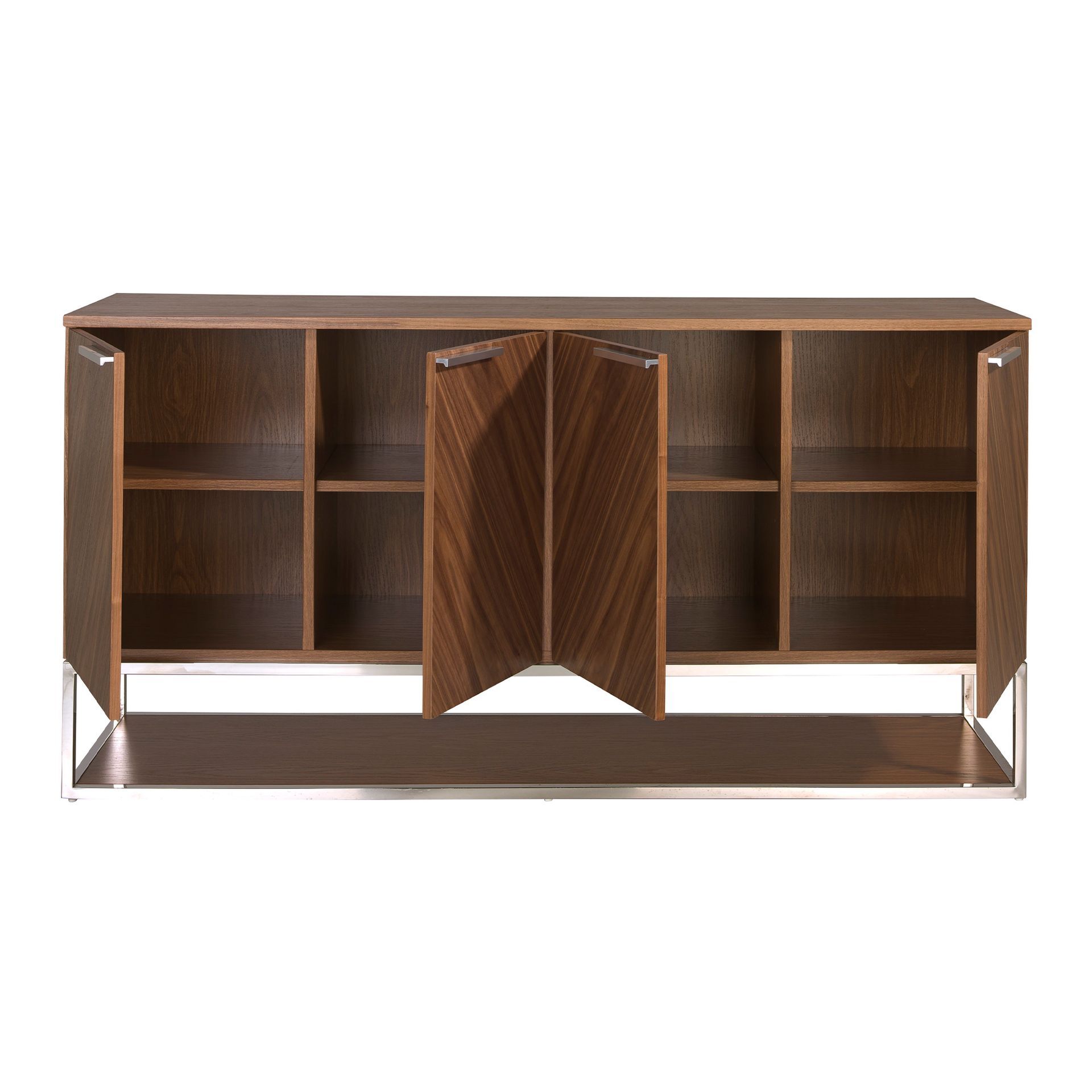 Буфет из шпона ореха с дверцами и внутренними полками для хранения. Структура ножек и ручек из хромированной нержавеющей стали.