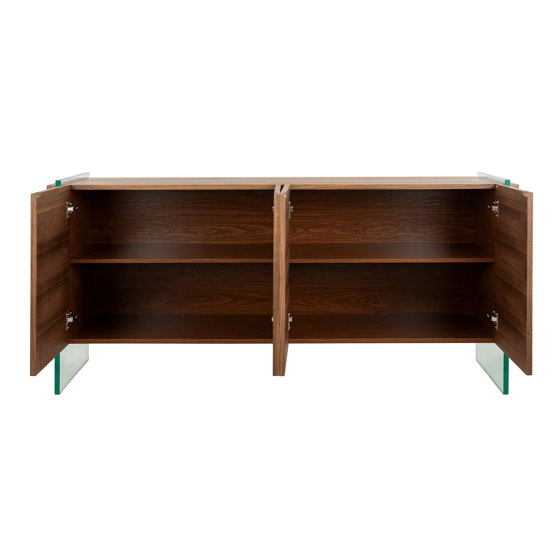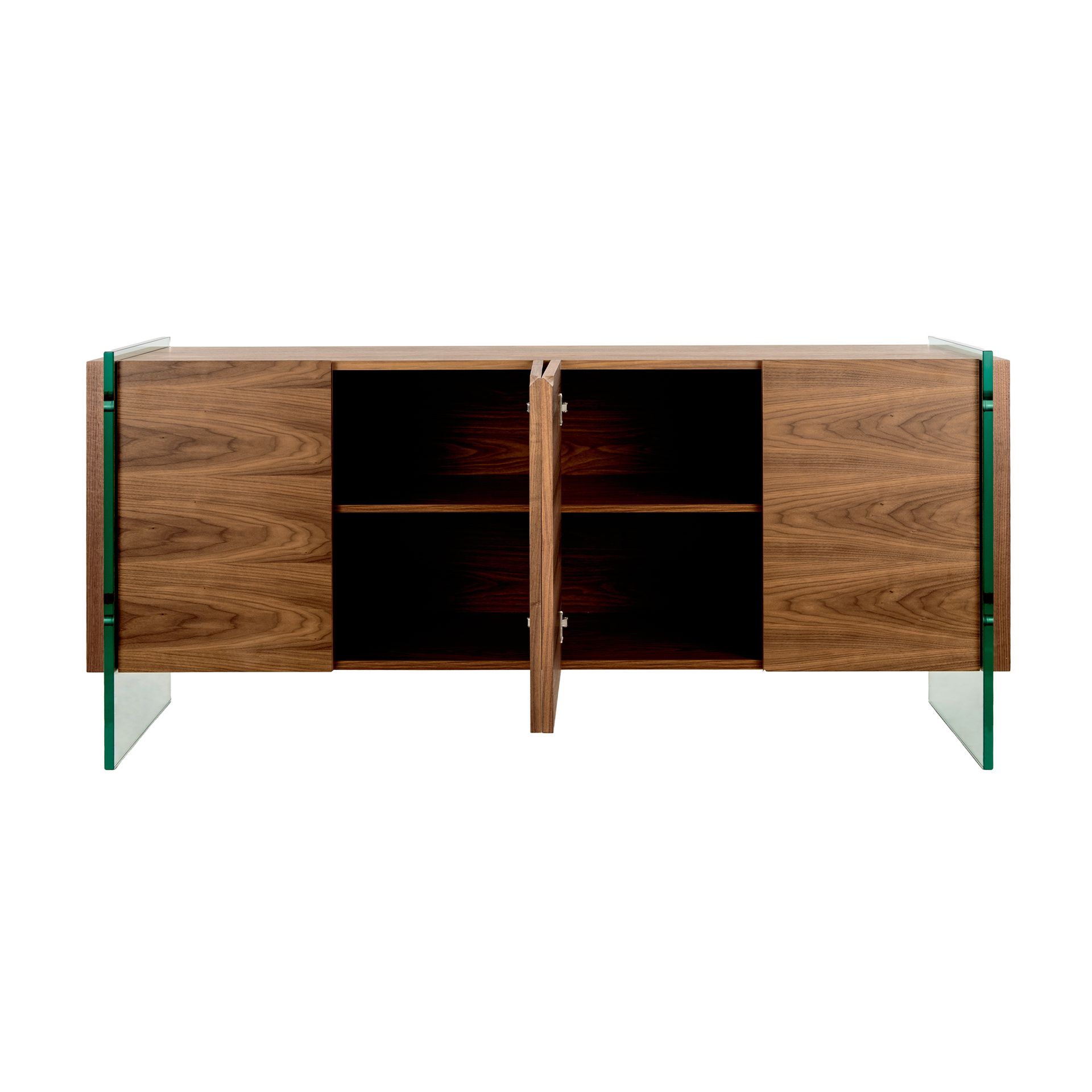 Комод 3057 — безупречная простота и практичность от фабрики Angel Cerda. Этот сервант создан для тех, кому нужны высокие полки и много места внутри. Здесь нет узких ящиков, но зато имеются большие секции, куда с легкостью поместятся не только книги, но и крупногабаритная посуда или бытовая техника. Дизайн оригинален тем, что тут ножками служат две панели из стекла. Это не делает изделие громоздким и дает акцент на удивительно красивую фактуру орехового дерева. Конструкционно сервант представляет собой прямоугольный каркас, разделенный вертикальной перегородкой на две половины. Каждый отсек закрывается на двухстворчатую дверь, оснащенную доводчиками. Внутри с каждой стороны предусмотрено по одной полке, которые находятся на одной высоте от основания каркаса. Материал изготовления — МДФ и шпон орехового дерева. Эта порода отличается прочностью, красивым и широко востребованным в современном интерьере природным рисунком. По бокам прикручены две панели из прозрачного ударопрочного стекла. Они проходят через всю высоту изделия и с внешней стороны закрываются деревянным накладками. Такой дизайнерский ход выглядит не только оригинально (словно стекла насквозь пронзают мебель), но и обеспечивает более надежную конструкцию. Размеры серванта: ширина — 170 см, высота — 77 см, глубина — 43 см. Необходима самостоятельная сборка (дверцы приходят отдельно). Инструкция и крепеж входят в комплектацию.