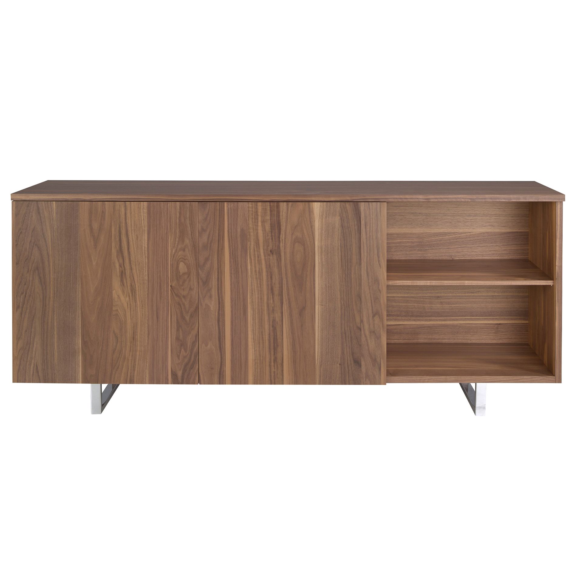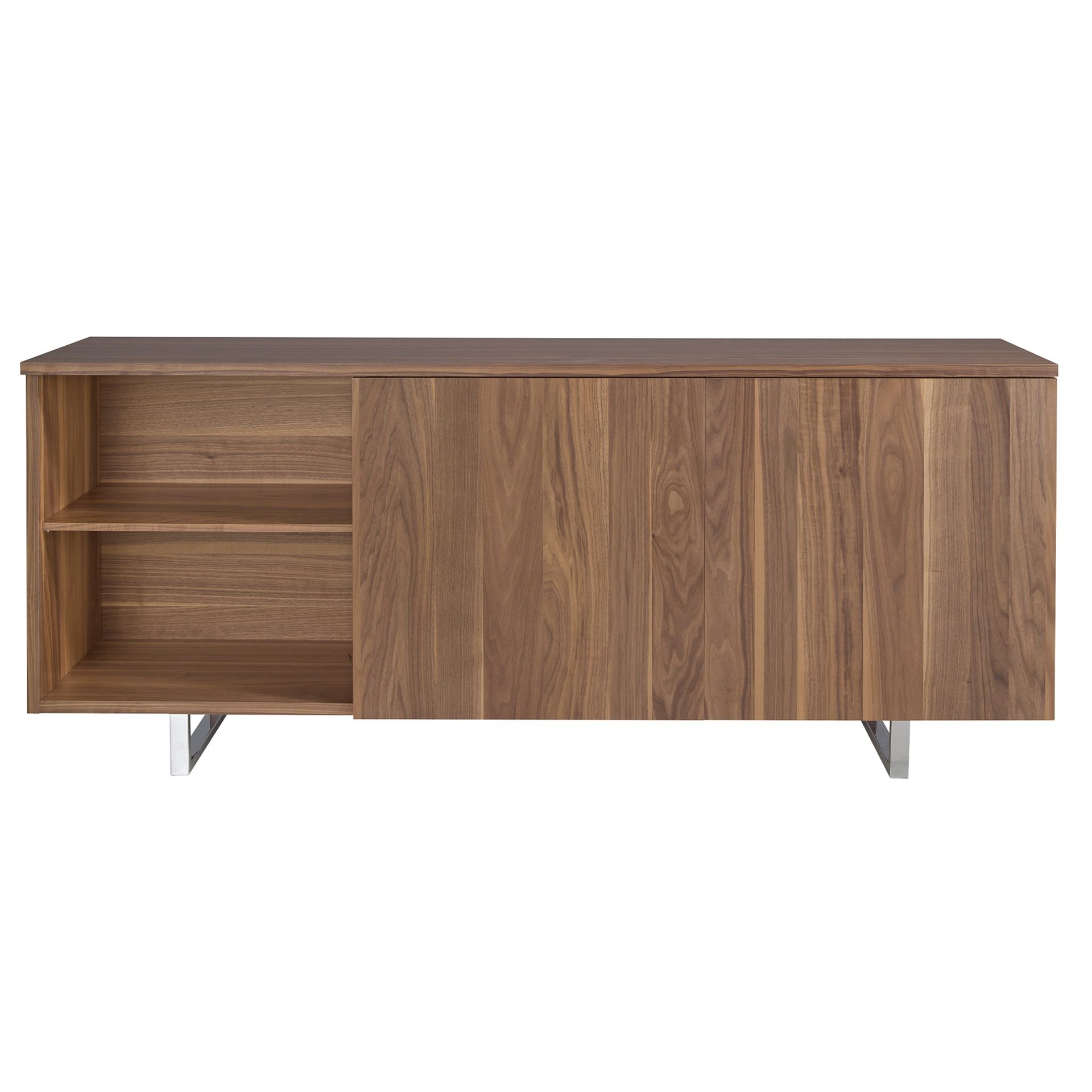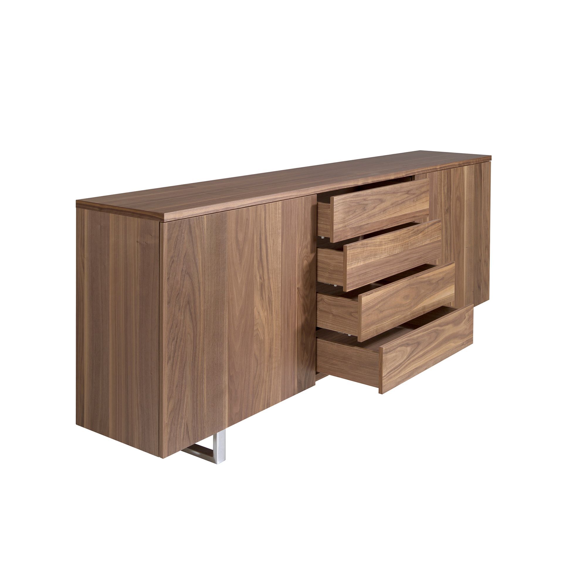 Материал изготовления — шпон орехового дерева с натуральным орнаментом и МДФ. Опирается сервант на стойку прямоугольной формы, которая крепится к основанию на болты. От опоры отходит две рамочные ножки, выполненные из хромированной стали. Такая конструкция обеспечивает хорошую устойчивость и стойкость к высокой весовой нагрузке.