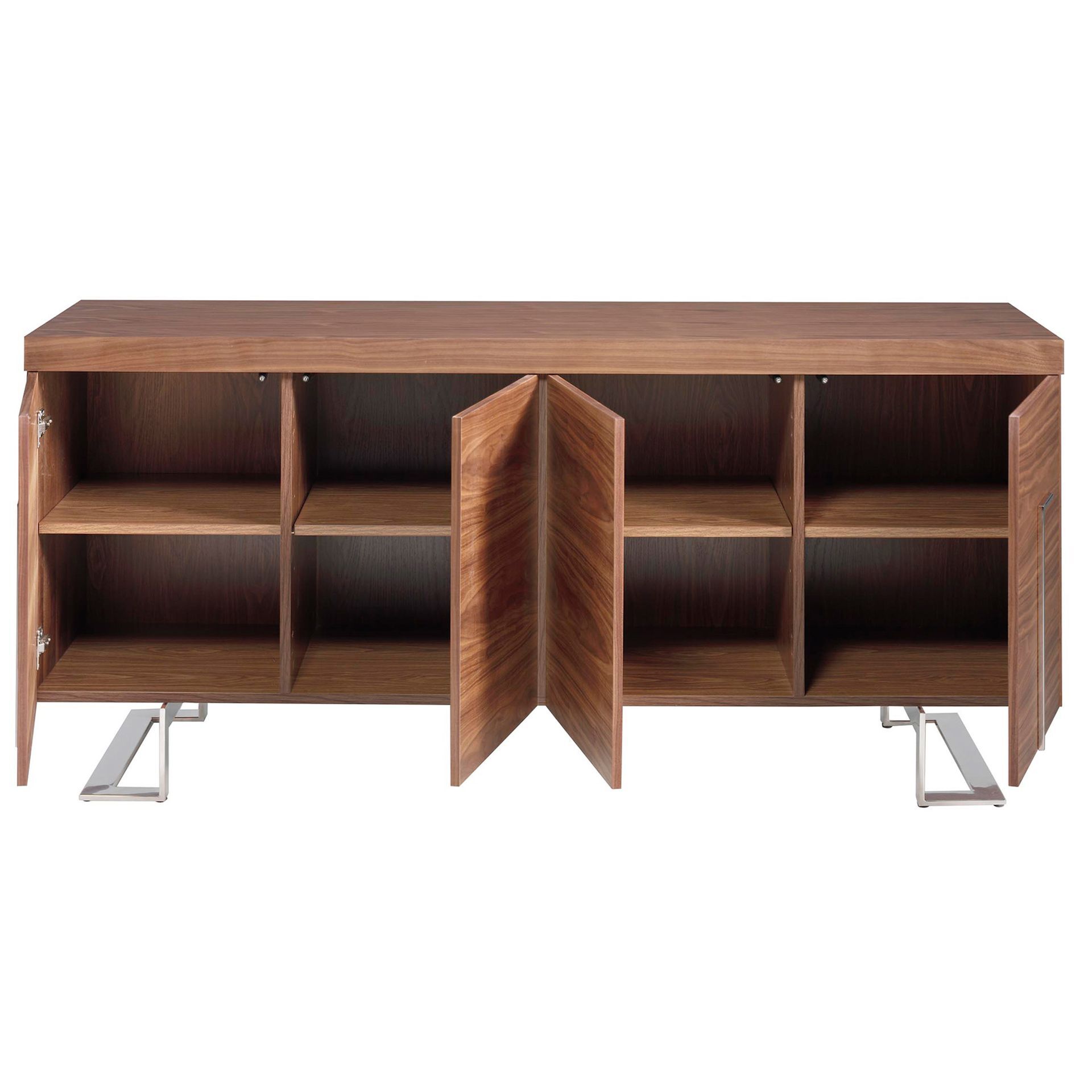 Сервант имеет каркасную основу, которая заполнена восемью полками одинакового размера. Шесть полок скрыты за распашными дверями на петлях, которые оснащены мягкой системой открытия, не имеют ручек.