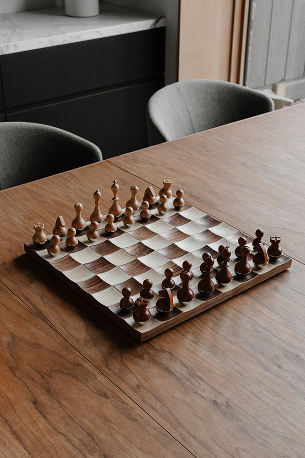 Восхитительный шахматный набор для ценителей элегантных вещей и необычного дизайна. Комбинация древесины ореха и клена, удивительно приятные на ощупь фигуры и главная особенность — вогнутые клетки шахматного поля. Благодаря утяжелению фигуры отлично держатся на такой доске, покачиваясь из стороны в сторону, но не падая (по принципу детской игрушки-неваляшки). Шахматы Wobble станут отличным подарком и для заядлых шахматистов, и для тех, кто просто любит красивые, роскошные вещи. Дизайнер Adin Mumma