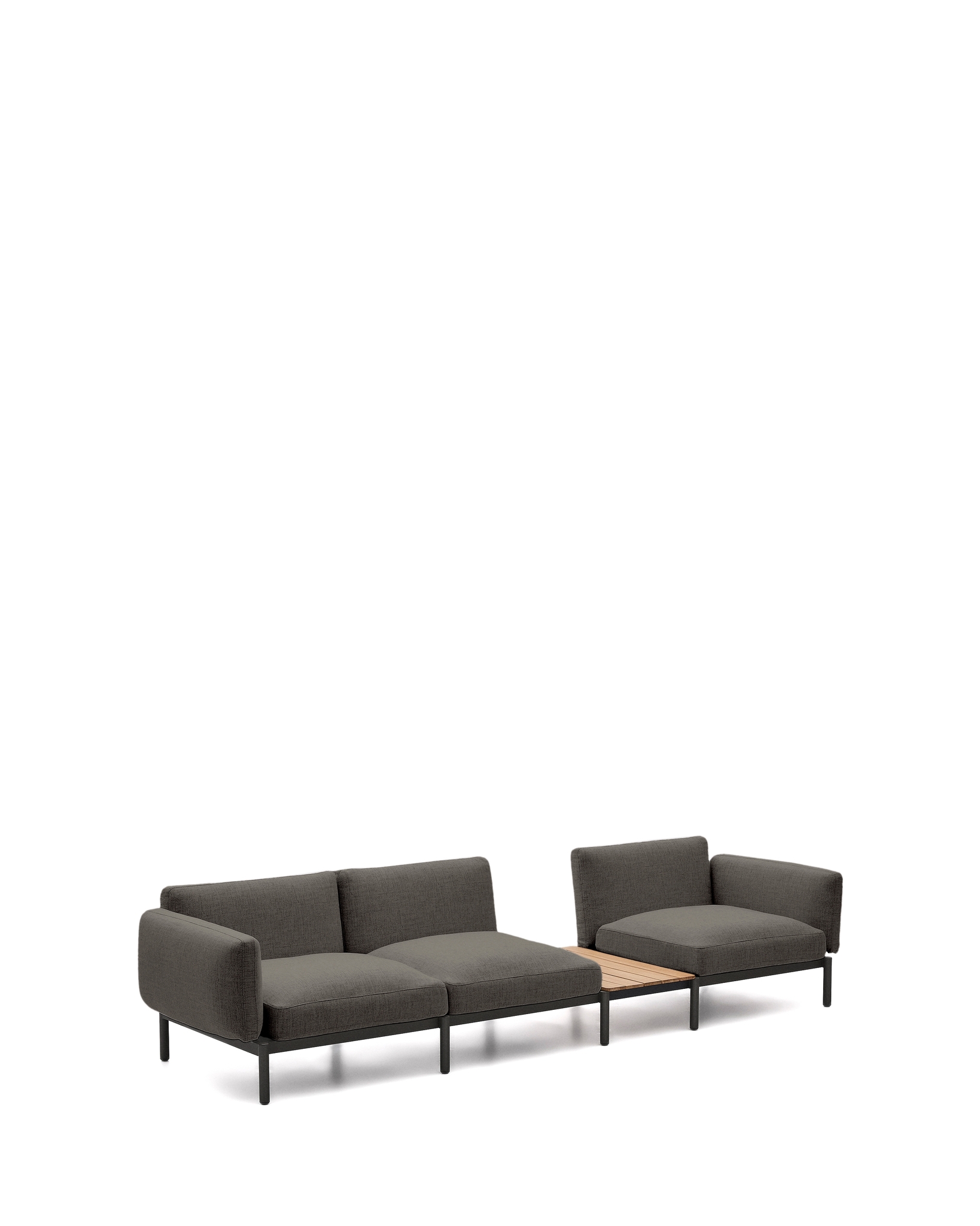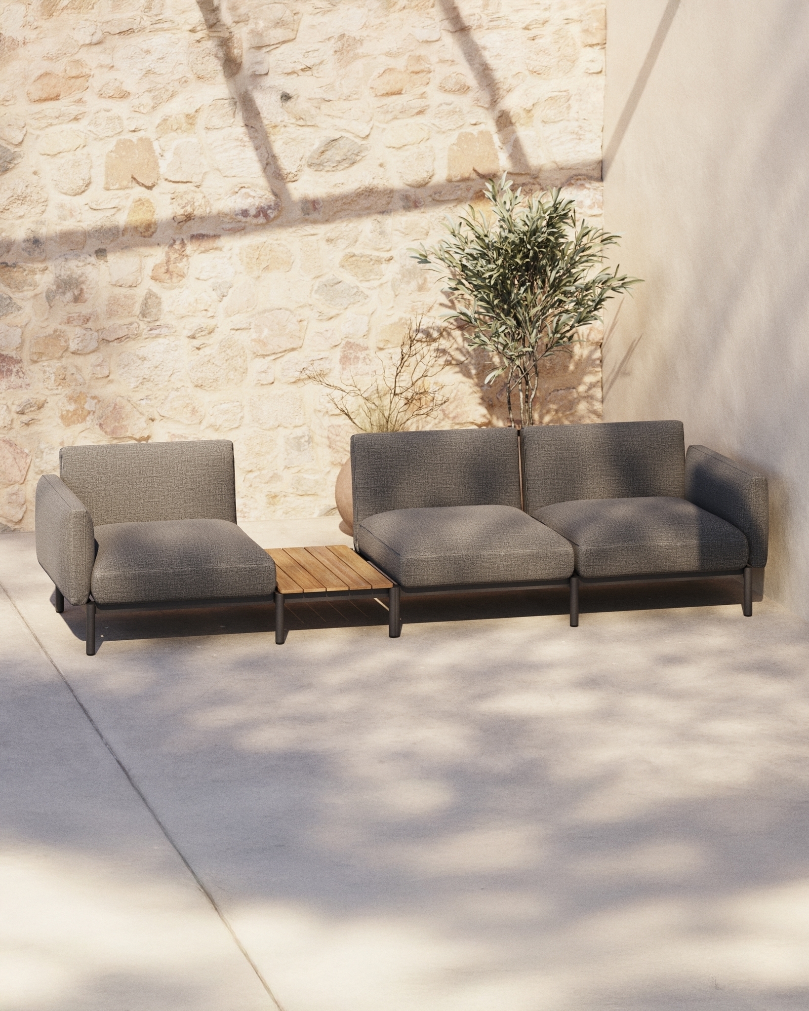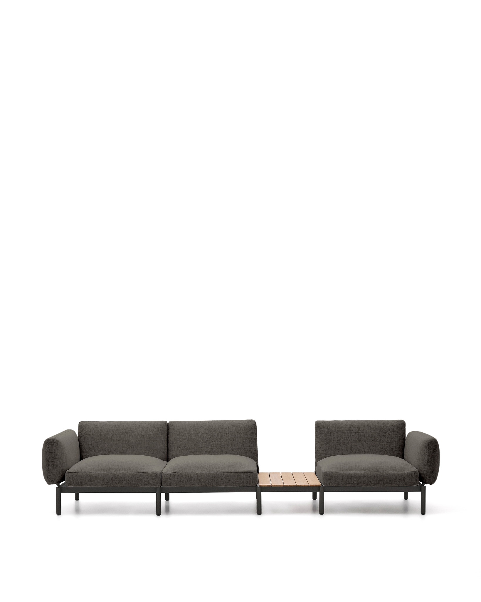 Sorells — это гораздо больше, чем просто модульный диван, это ключевой элемент для преобразования вашего пространства на открытом воздухе с аутентичным стилем и комфортом. Разработанный эксклюзивно Made Studio для Kave Home, Sorells сочетает в себе универсальность модульной конструкции с прочностью высококачественных материалов. Его алюминиевая структура, которая легкая и устойчива к ржавчине, коррозии и ультрафиолетовому излучению, обеспечивает исключительную долговечность на открытом воздухе. К этому добавляется темно-серая обивка, призванная добавить изысканности и тепла