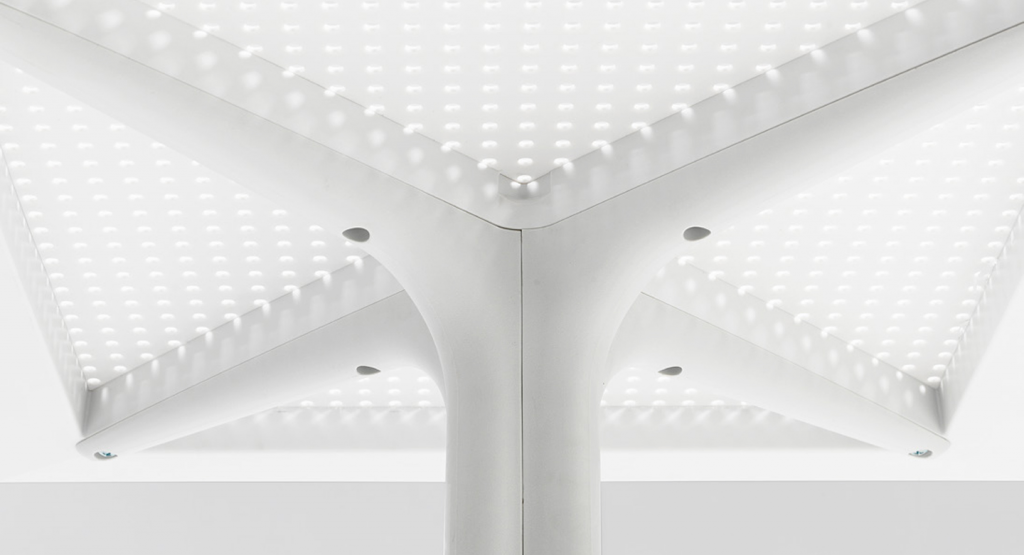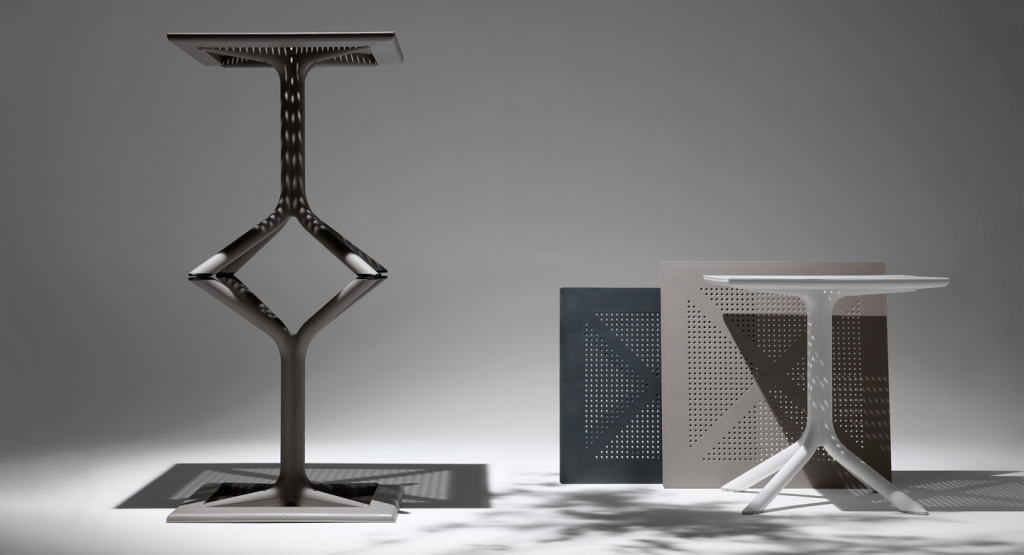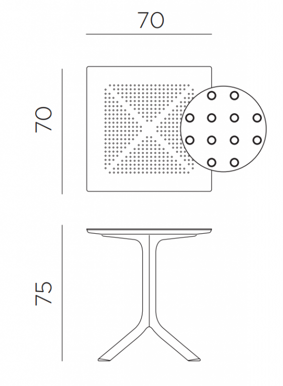 Специально разработанный для того, чтобы занимать очень мало места, Clip представляет собой профессиональный квадратный стол из стеклопластика, состоящий из центральной колонны с 4-мя ножками и столешницы DurelTop, на которой выгравирован круглый перфорированный рисунок.