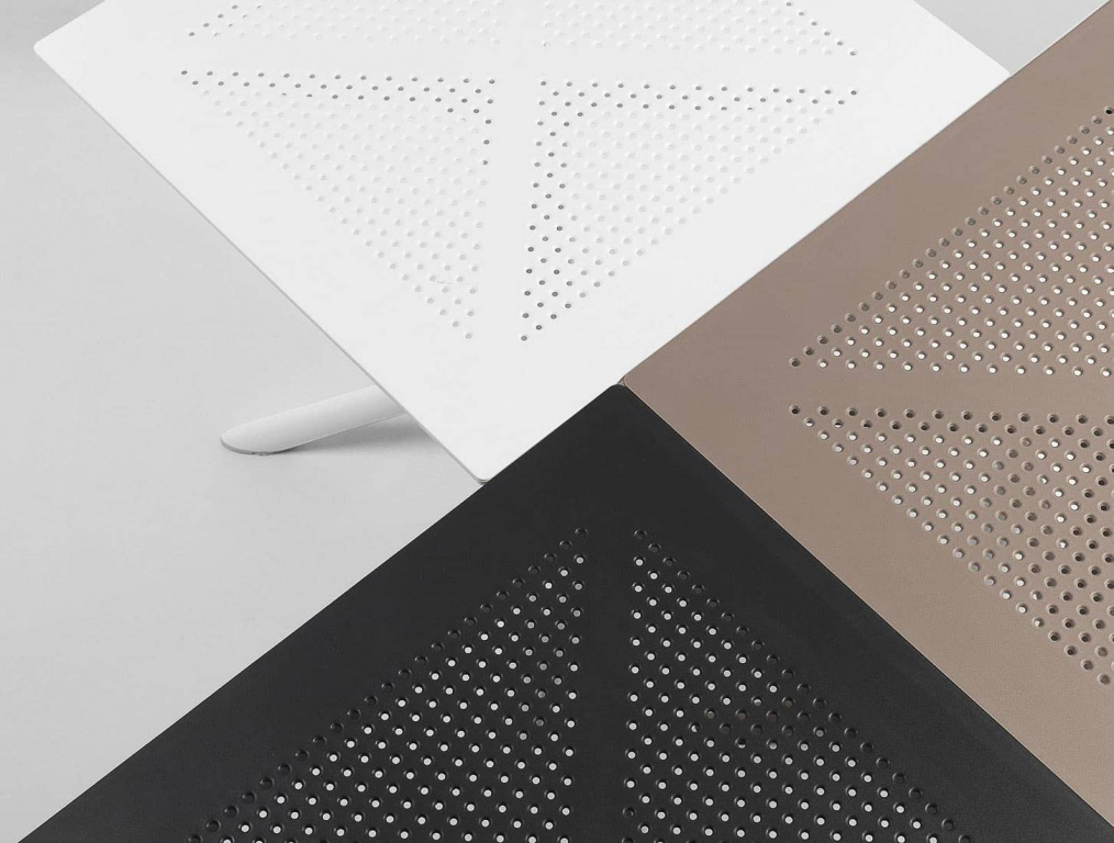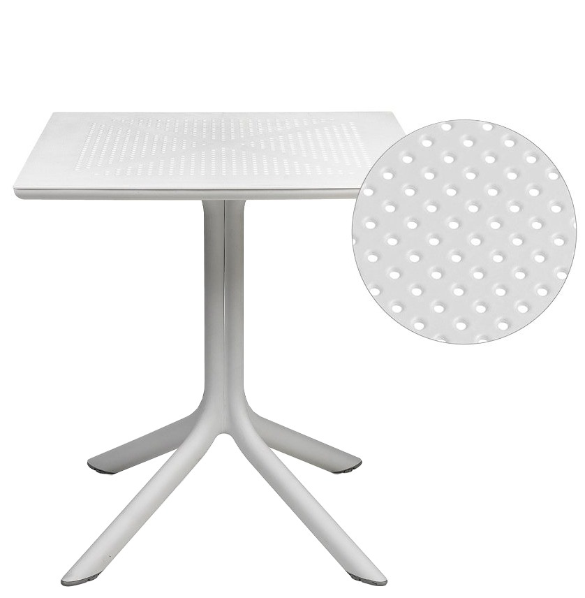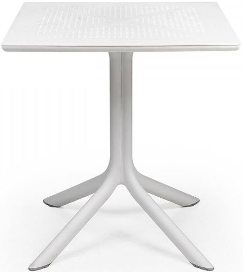 Специально разработанный для того, чтобы занимать очень мало места, Clip представляет собой профессиональный квадратный стол из стеклопластика, состоящий из центральной колонны с 4-мя ножками и столешницы DurelTop, на которой выгравирован круглый перфорированный рисунок.