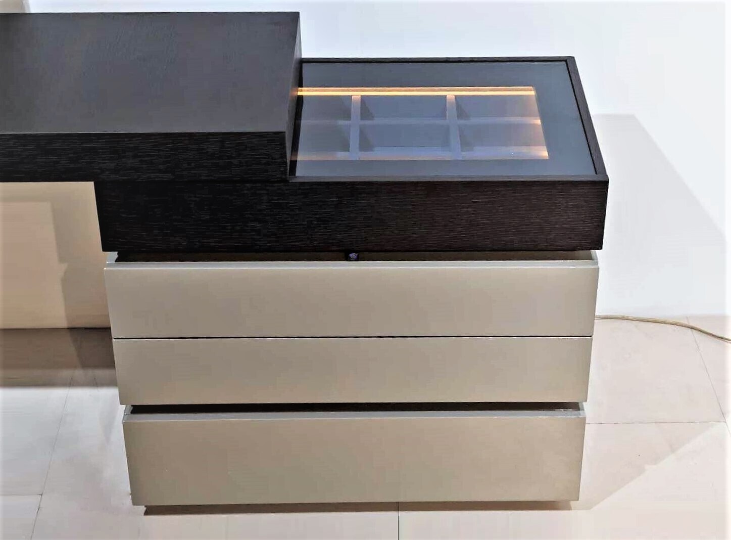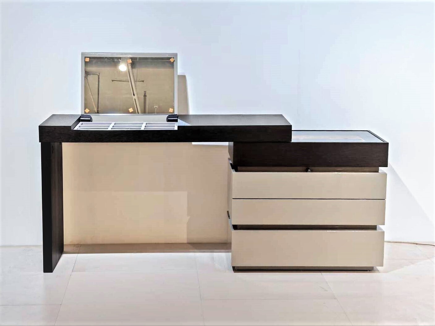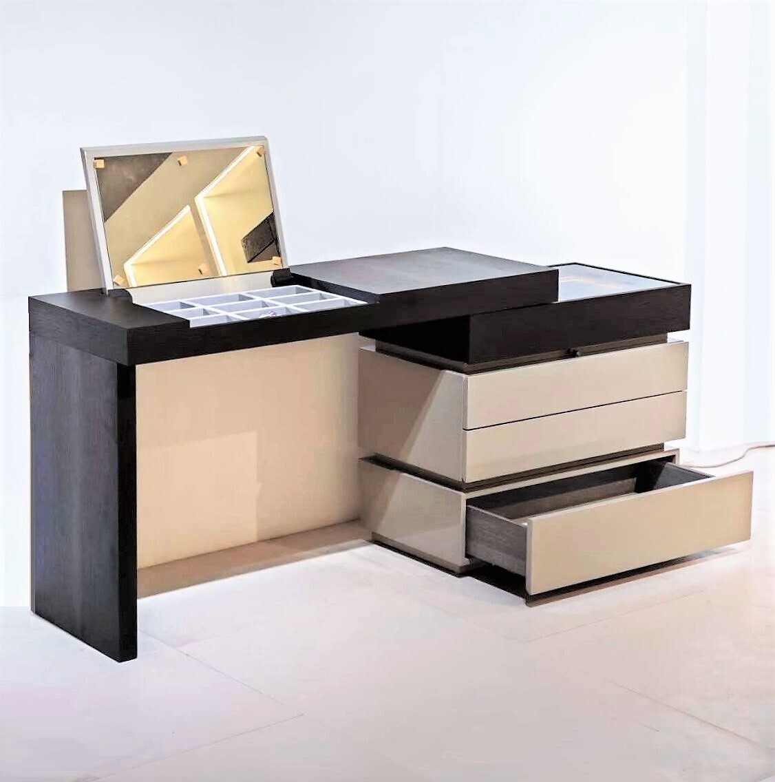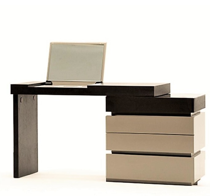 Отделка столика выполнена из натурального шпона цвета Венге.Три выдвижных ящика с плавным ходом и доводчиками. Ящики бежевого цвета. Ручки интегрированы в фасад ящиков.