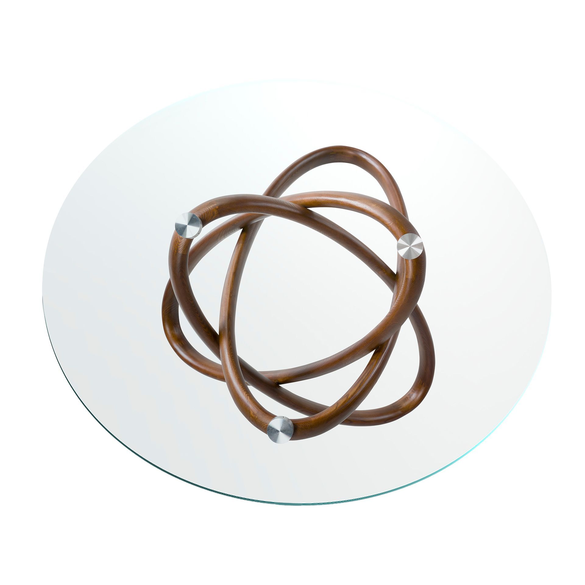 Данная модель создана в современном стиле, но имеет очень необычный дизайн. Стойка представляет собой три кольца из натурального дерева (два овальных и одно круглое), которые, проходя сквозь друг друга, поддерживают столешницу в трех точках. Столешница изготовлена из закаленного стекла, стойкого к ударам и воздействию высоких температур. Она круглая и, в зависимости от выбранной модели, имеет диаметр 130, 140 или 150 см. Высота стола составляет 75 см.