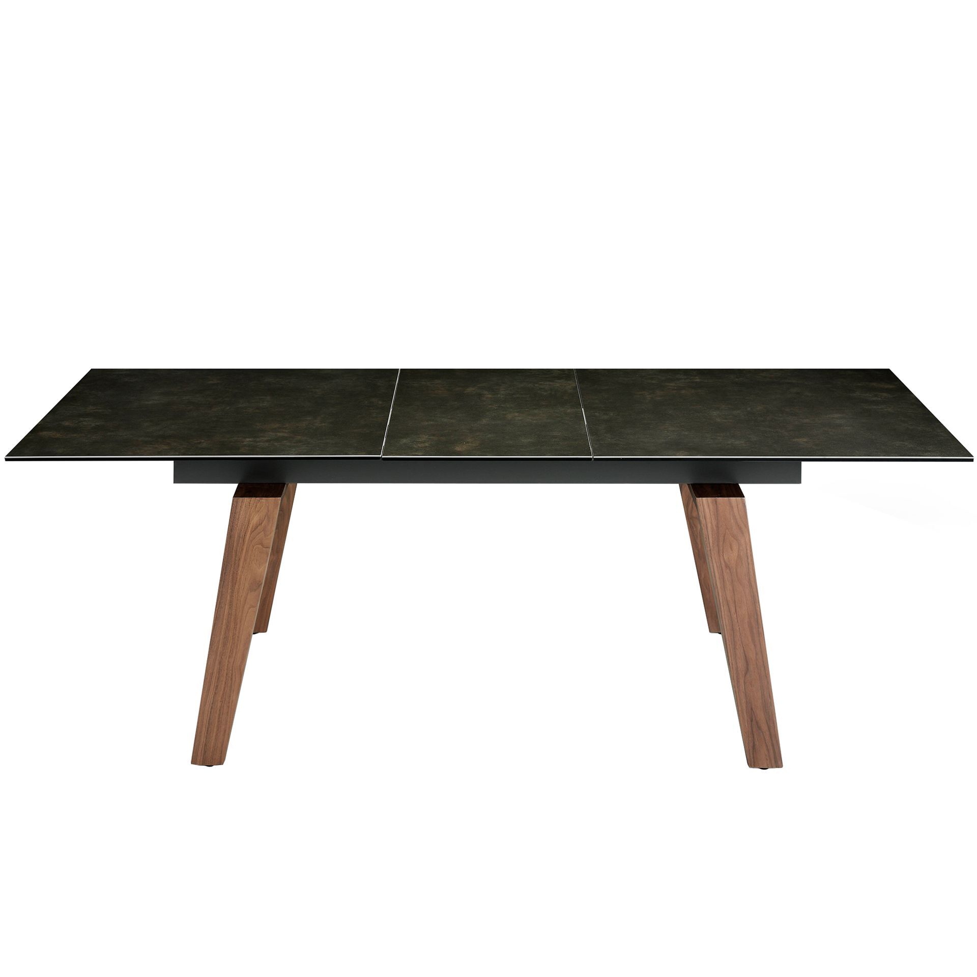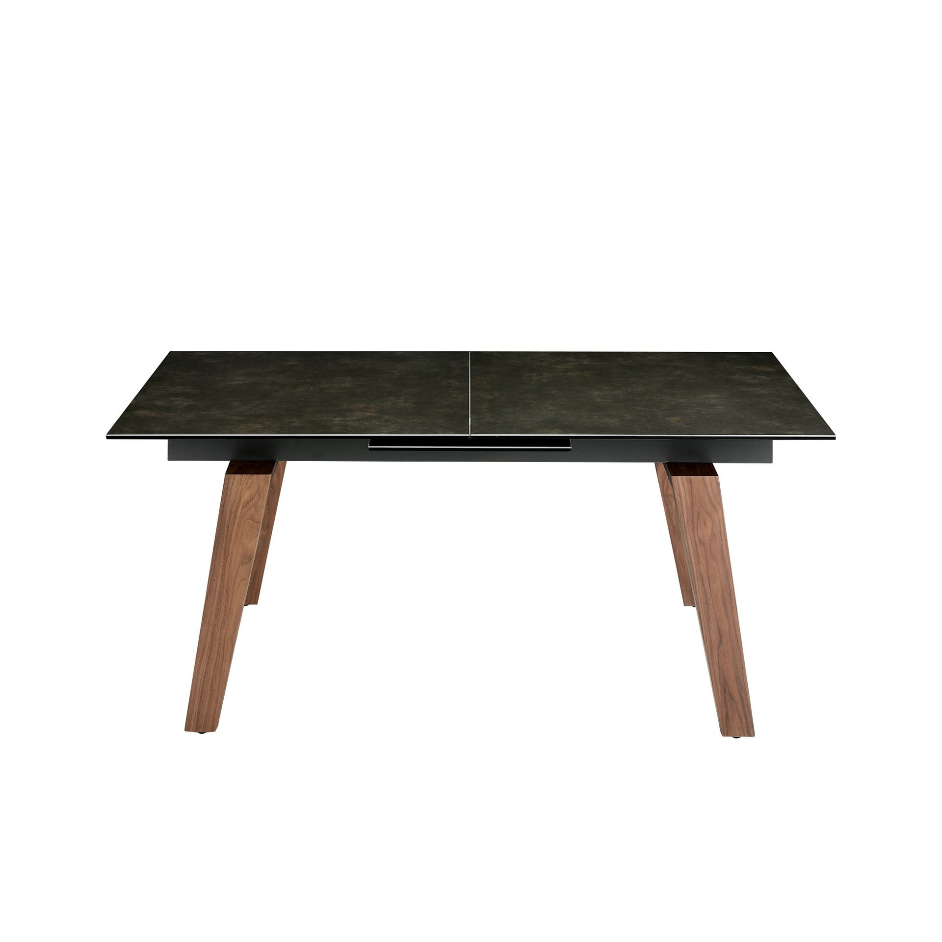 Конструкция стола простая. Он состоит из керамической столешницы прямоугольной формы и деревянной опоры, образующей четыре ноги. Ножкам оставлен натуральный цвет, но для защиты от влаги и загрязнений есть специальное покрытие. Столешница черного неоднородного цвета (имитация под камень). Чтобы ее раздвинуть, достаточно потянуть за края с обеих сторон и извлечь дополнительную секцию. Ее нужно приподнять и уложить на подпорки (для этого имеется специальный крепеж).