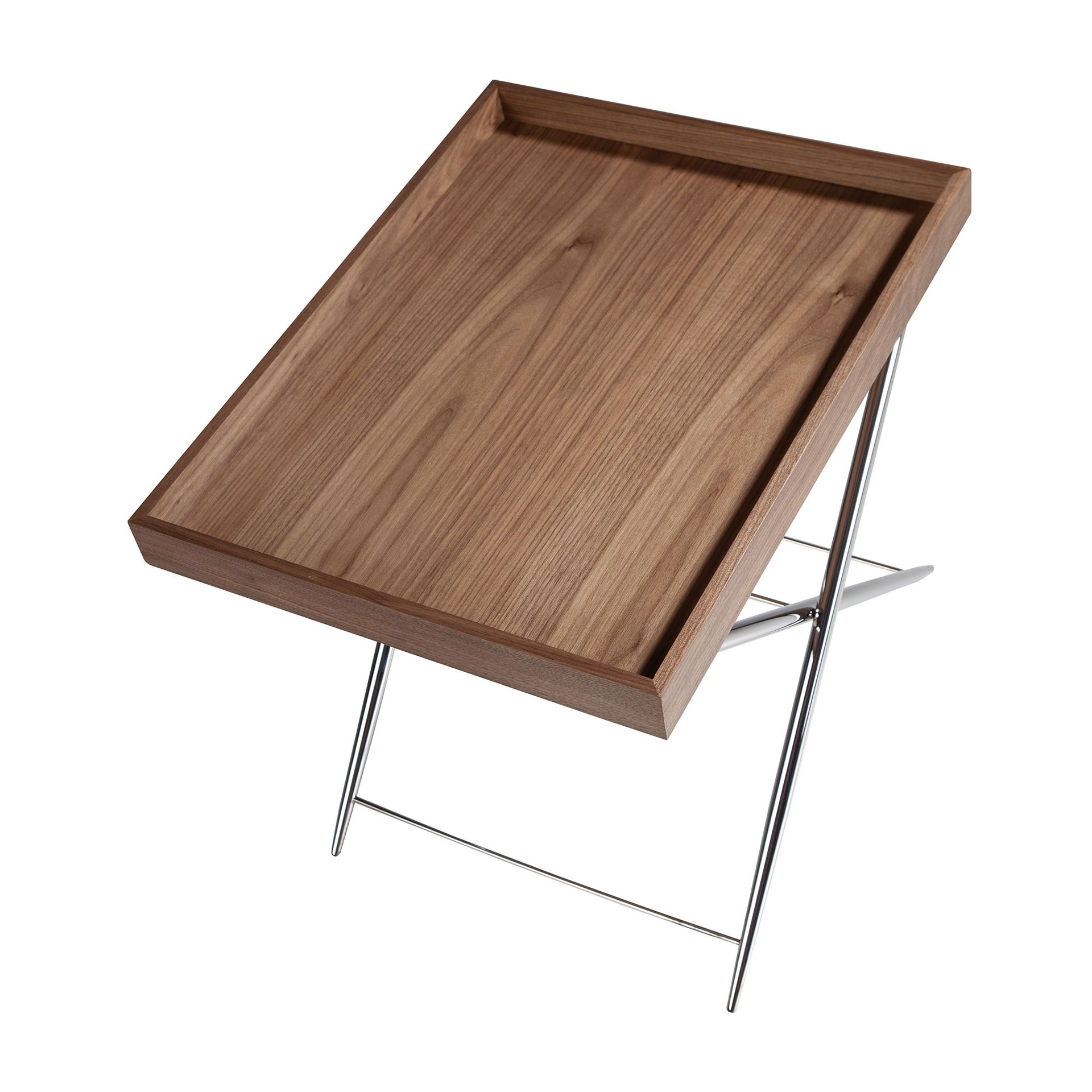 Столик Calidez имеет прямоугольную форму. Столешница по всему периметру оснащена бортиками одинаковой высоты. Благодаря им, со стола не укатятся круглые предметы, а бьющаяся посуда будет точно полностью стоять на поверхности и не окажется на весу.