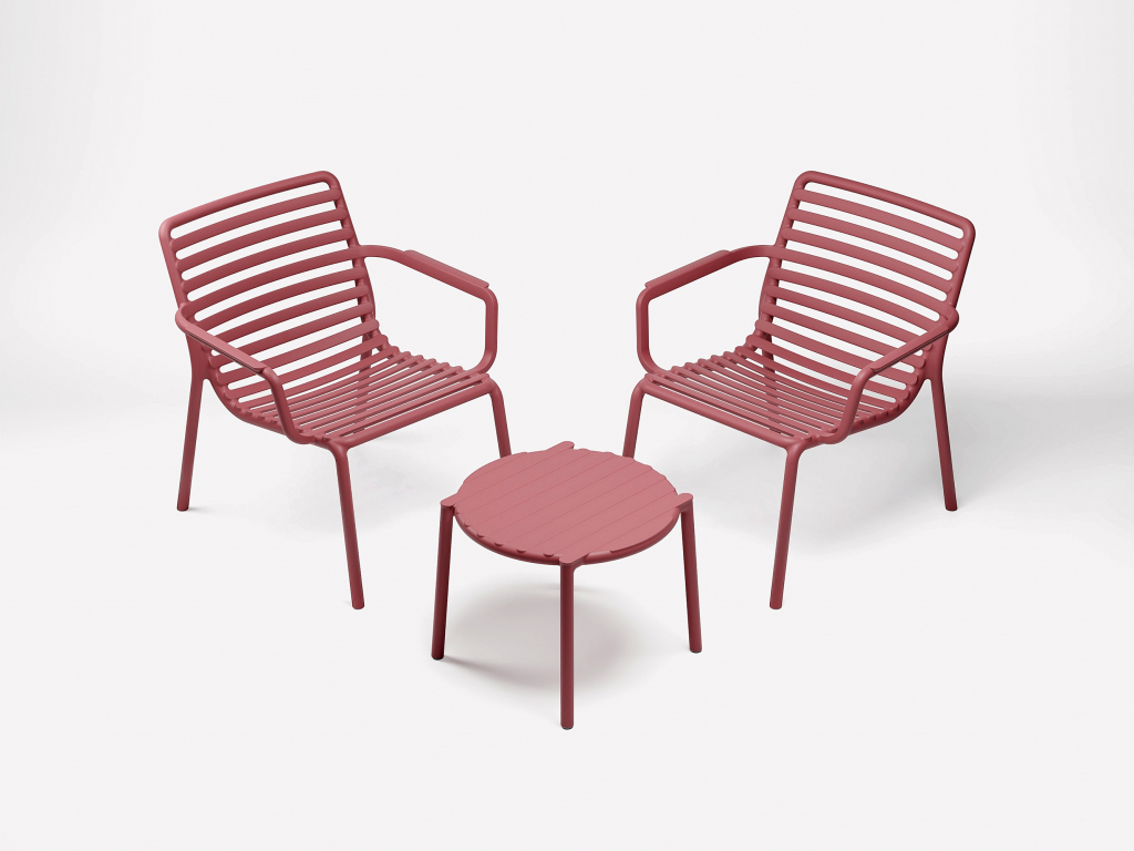Свежая, легкая и эргономичная, Doga - это новая очаровательная коллекция уличной мебели: стулья с подлокотниками и без них, кресло для отдыха и моноблочный журнальный столик из стеклопластика (полипропилен и стекловолокно). Вся коллекция была вдохновлена решетчатым дизайном, но Рафаэлло Галиотто, ее дизайнер, придал ей современный оттенок. Плавные линии спинки и сиденья стульев характеризуются игрой заполнений и пустот, отмеченных последовательностью горизонтальных планок.