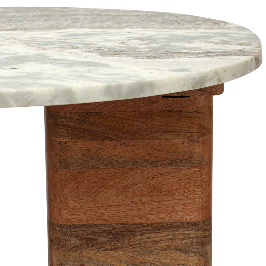 - Универсальность мрамора и естественный оттенок древесины позволяют вписать столик в интерьер, оформленный в любой цветовой гамме.