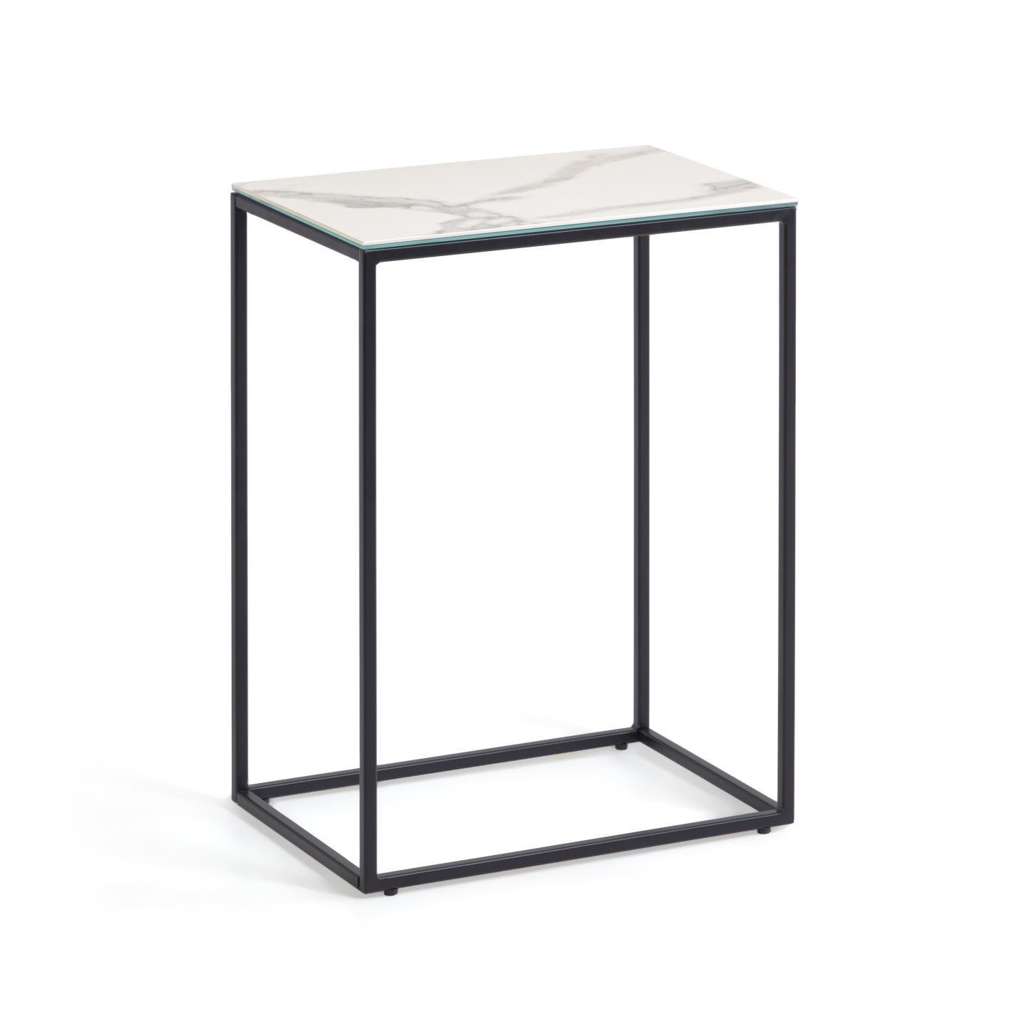 Приставной стол Rewena от фабрики La Forma – керамическая столешница на стальном основании в духе минимализма. Приставной стол Rewena не оставляет сомнений в том, что является ярким представителем минимализма. Простая конструкция и практичность, прочность и современные материалы – все это видно невооруженным взглядом. Когда нужно добавить немного удобства в интерьер, но без «перегруза», то Rewena будет кстати. Стол прямоугольной формы. Столешница сделана из закаленного стекла и керамики (двухслойная). Она имеет толщину 7 мм, ударопрочная, легко очищается от загрязнений. Каркас металлический, покрыт черной порошковой краской. Он имеет сварную рамочную структуру, с шириной ножек 1,3 см. Для защиты напольного покрытия, на углах основания предусмотрены пластиковые накладки. Максимальная нагрузка на столик не должна превышать 30 кг. Размеры: ширина – 45 см, глубина – 30 см, высота – 60 см. Вес – 5,9 кг. Потребуется сборка.