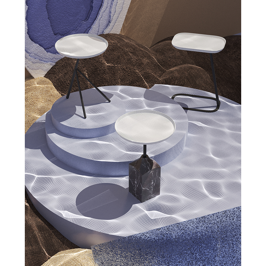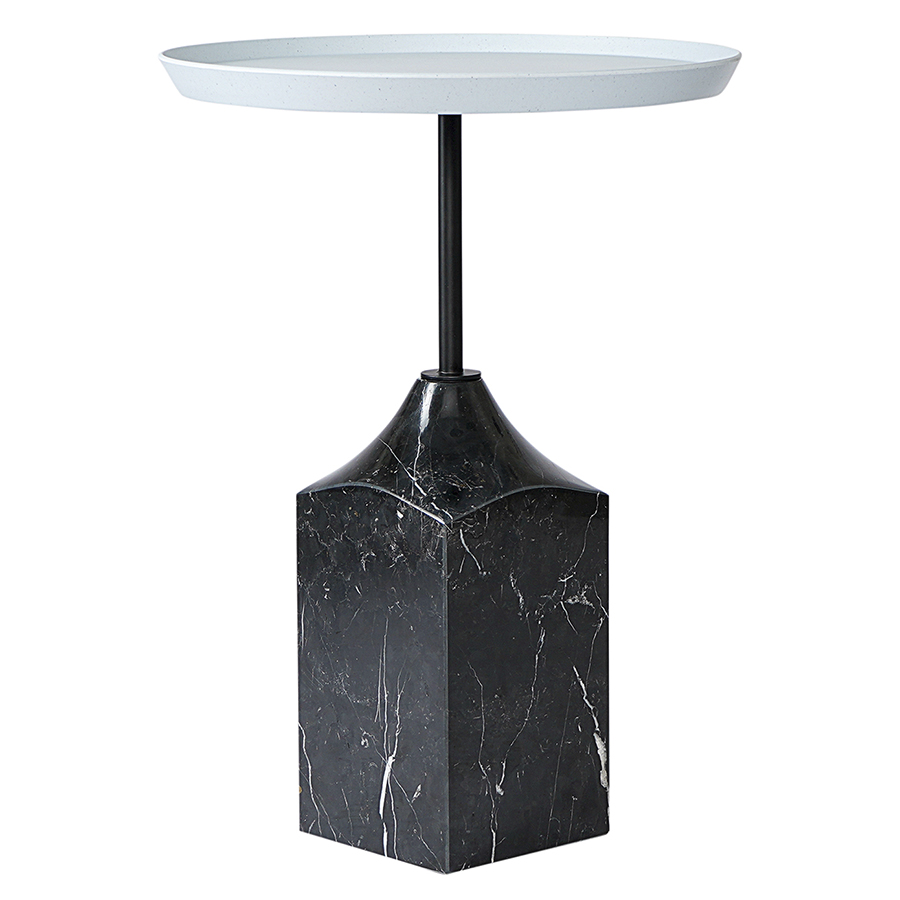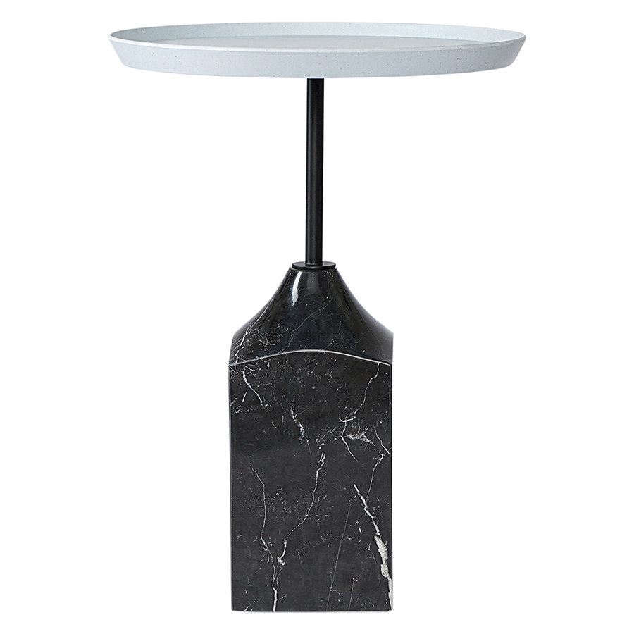 Материалы: столешница – переработанный материал, каркас – сталь, основание – мрамор. Размеры: 38х38х53 см. Цвет: серый/черно-белый.