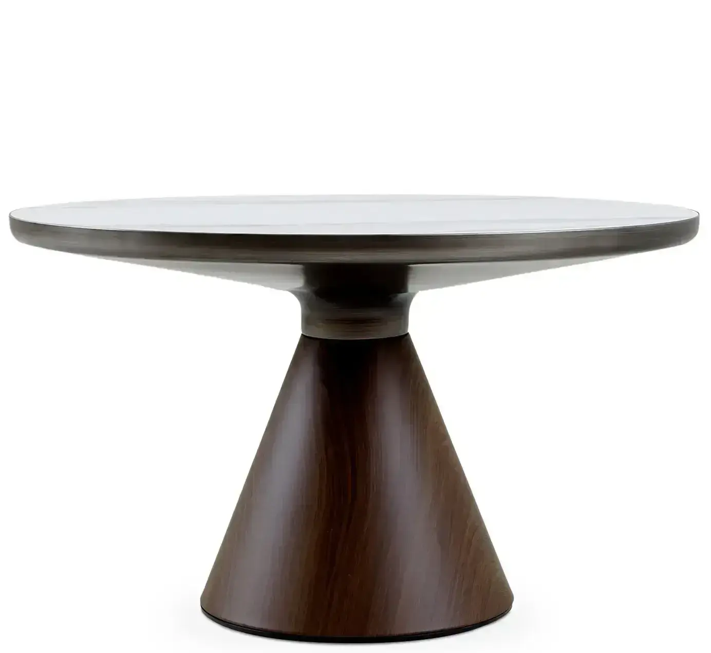 Материал столешницы - спеченный камень с фактурой под керамику, материал опоры - металл в цвете грецкий орех.