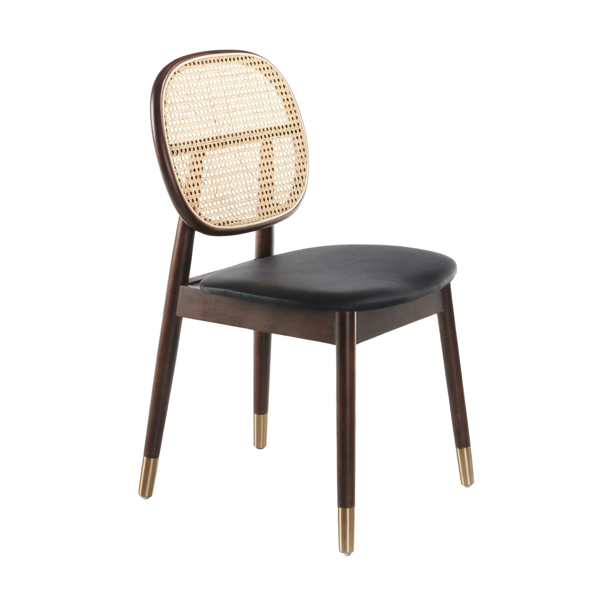 Обеденный стул из массива ясеня, окрашенный в цвет орехового дерева, с сиденьем, обитым черным кожзаменителем, и спинкой из ротанга. Сиденье заполнено вспененным полиэфиром плотностью 25 кг / м3. Стальные ножки золотистого цвета.