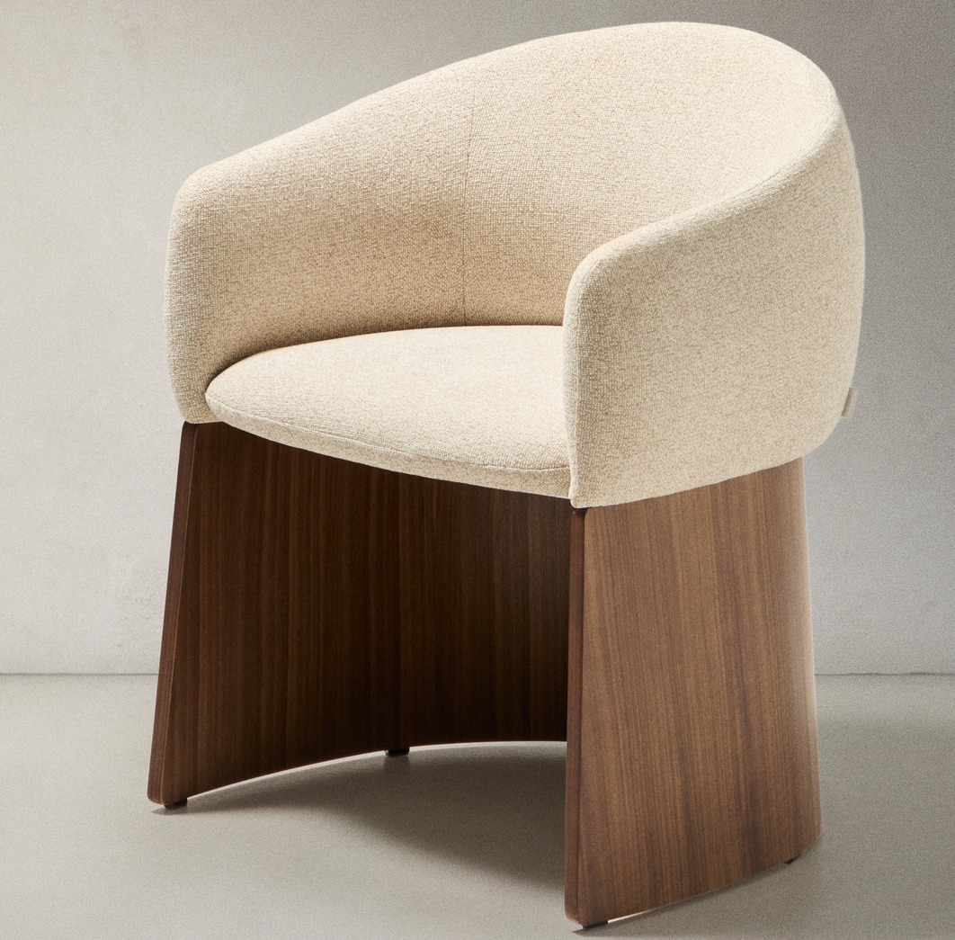 Этот стул отличается сбалансированным дизайном: широкое, удобное сиденье опирается на деревянное основание, покрытое ореховым шпоном. Матовое полиуретановое покрытие защищает поверхность и придает изделию теплоту. Древесина сертифицирована по системе FSC™ 100% и соответствует модели ответственного лесоуправления. Обивка выполнена из мелкоструктурного шенилла: мягкого на ощупь, прочного и долговечного, изготовленного из 100% переработанного полиэстера от поставщика, сертифицированного по Глобальному стандарту переработки.