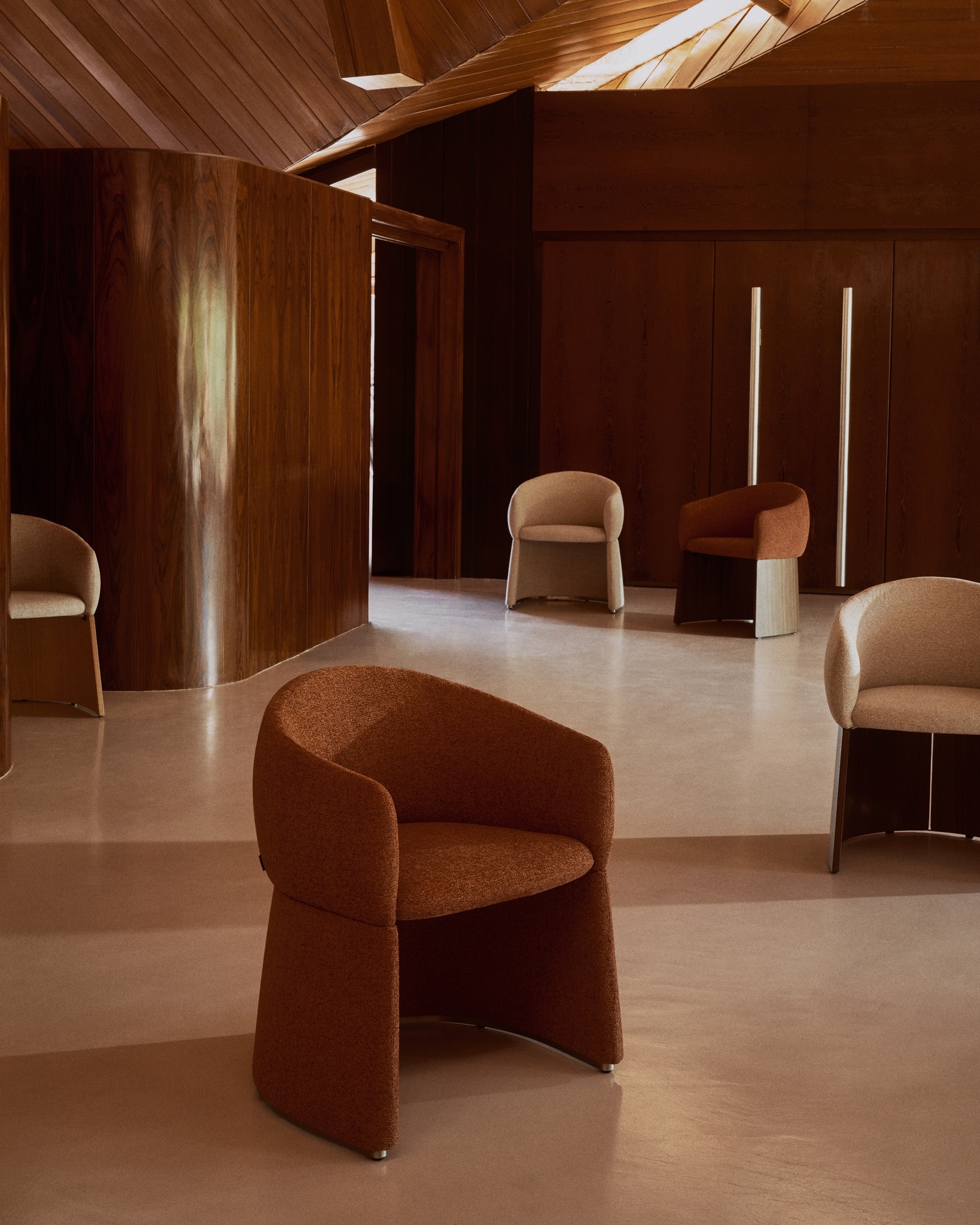 Этот стул выделяется своим скульптурным дизайном, в котором обволакивающие формы гармонично сочетаются с утончённым, изысканным силуэтом. Широкое, уютное сиденье опирается на обитое фанерное основание с металлическим каркасом по периметру для защиты ткани. Обивка выполнена из мелкоструктурированного шенилла: мягкого на ощупь, прочного для ежедневного использования и изготовленного из 100% переработанного полиэстера от поставщика, сертифицированного по Глобальному стандарту переработки. Эта ткань обработана водоотталкивающими составами и имеет сертификат OEKO-TEX® S.