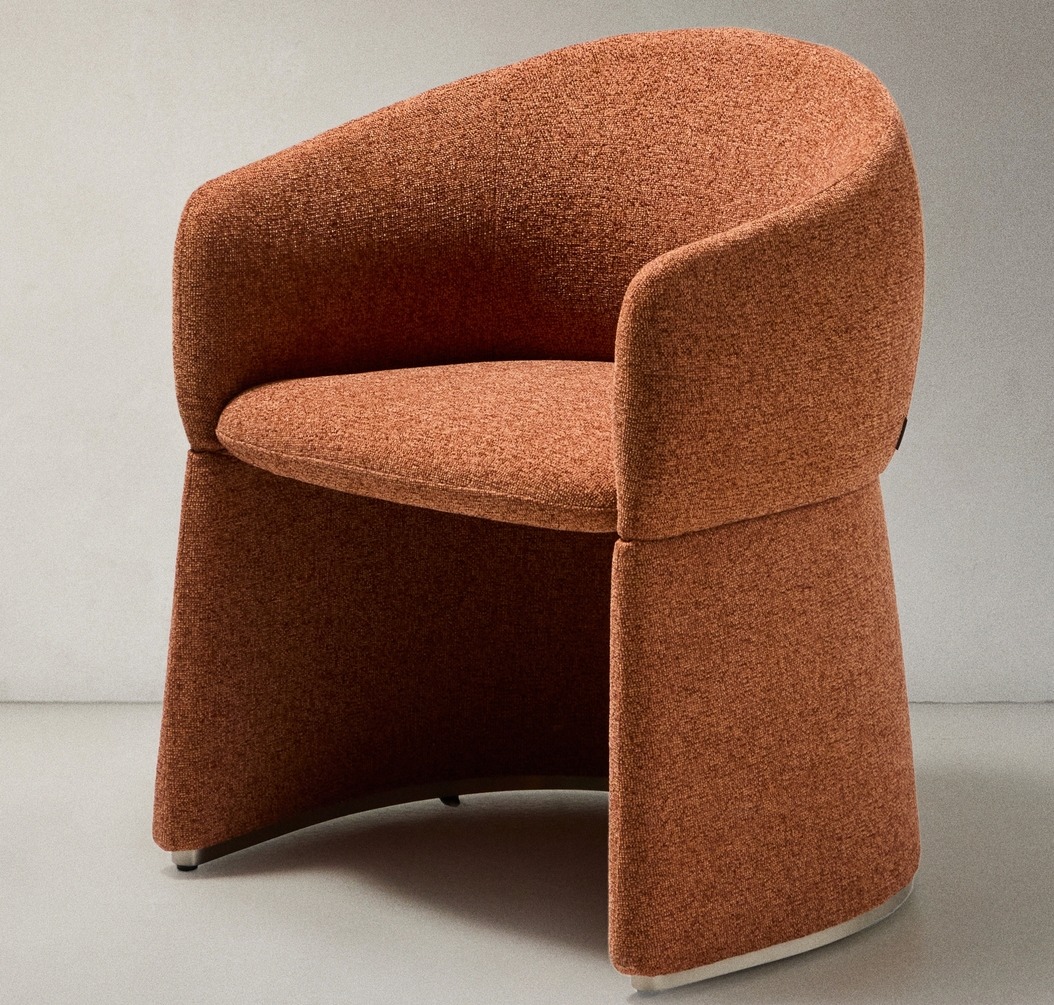 Этот стул выделяется своим скульптурным дизайном, в котором обволакивающие формы гармонично сочетаются с утончённым, изысканным силуэтом. Широкое, уютное сиденье опирается на обитое фанерное основание с металлическим каркасом по периметру для защиты ткани. Обивка выполнена из мелкоструктурированного шенилла: мягкого на ощупь, прочного для ежедневного использования и изготовленного из 100% переработанного полиэстера от поставщика, сертифицированного по Глобальному стандарту переработки. Эта ткань обработана водоотталкивающими составами и имеет сертификат OEKO-TEX® S.